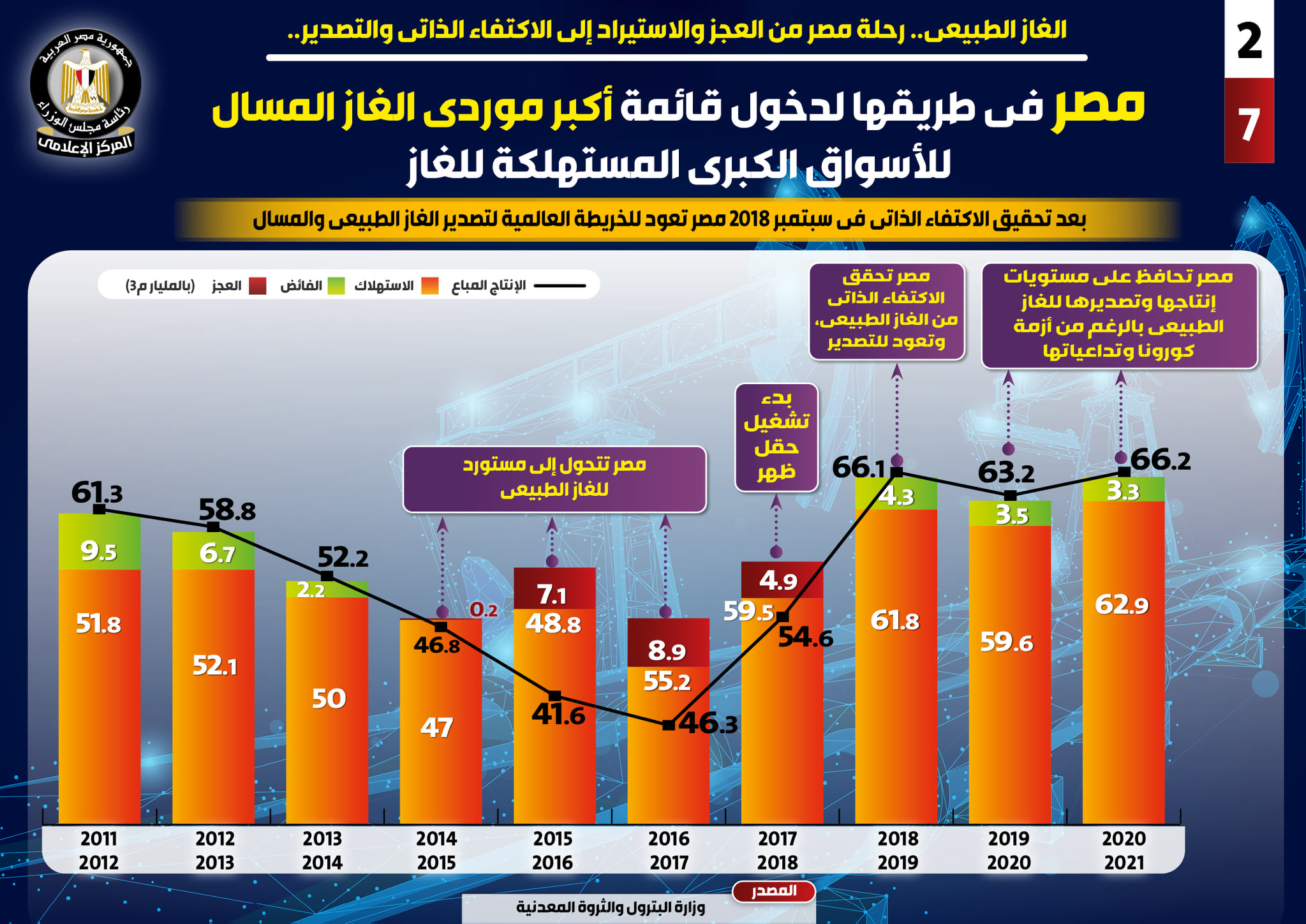 وفي هذا الصدد نشر المركز الإعلامي لمجلس الوزراء تقريراً تضمن إنفوجرافات تسلط الضوء على جهود مصر لدخول قائمة أكبر موردي الغاز المسال للأسواق الكبرى المستهلكة للغاز، وذلك بعد تحقيقها الاكتفاء الذاتي منه.
