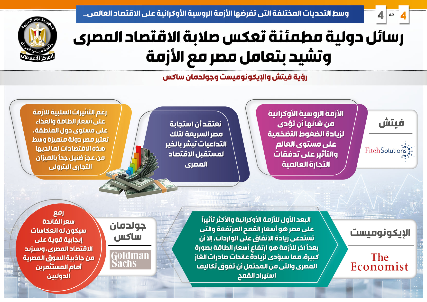 وفي هذا الصدد نشر المركز الإعلامي لمجلس الوزراء تقريراً تضمن إنفوجرافات تسلط الضوء على الرسائل الدولية المطمئنة التي تعكس صلابة الاقتصاد المصري وتشيد بتعامل مصر مع التحديات المختلفة التى تفرضها الأزمة الروسية الأوكرانية على الاقتصاد العالمي.