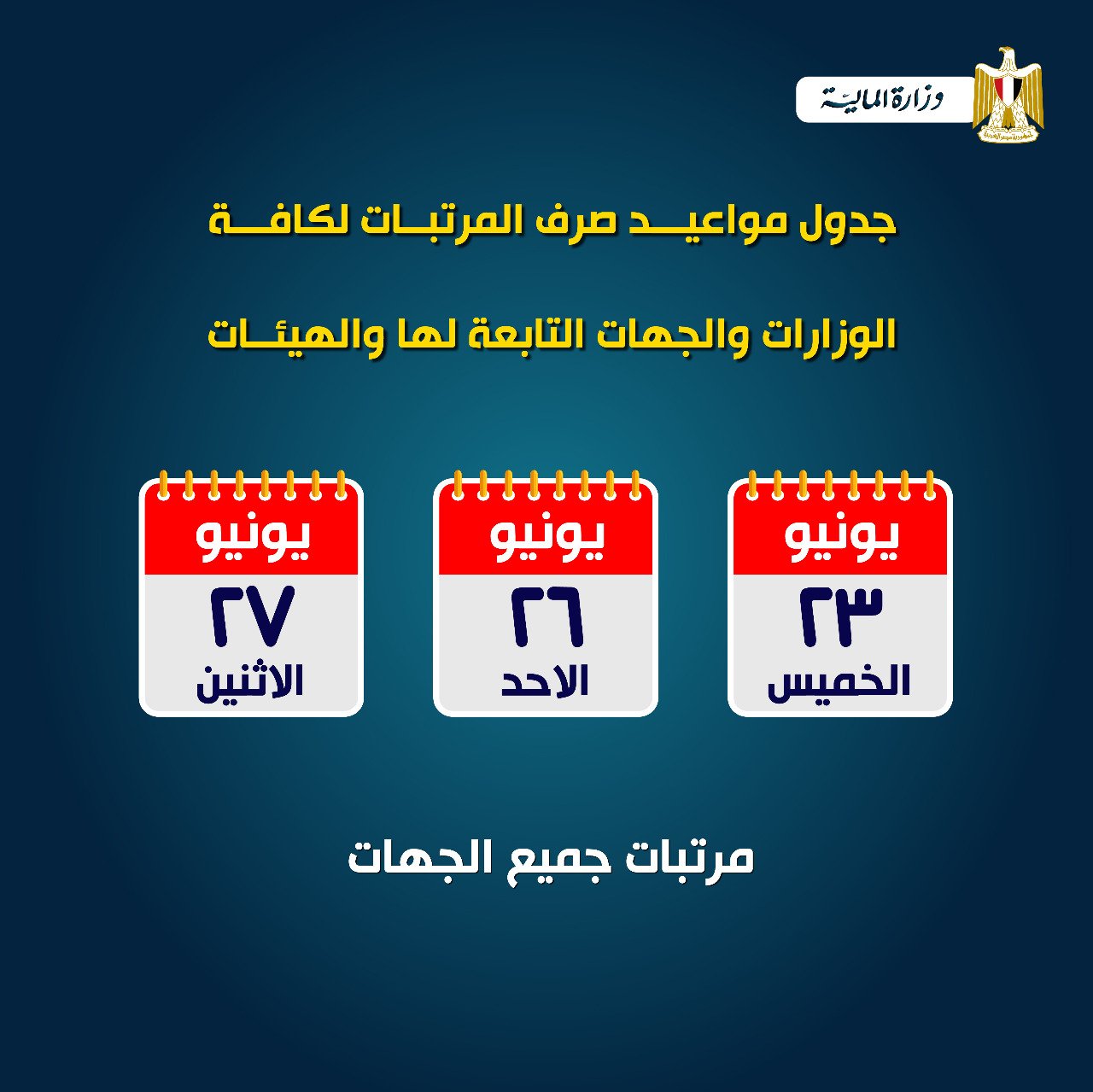 في حين يتم صرف مرتبات كافة الوزارات والجهات التابعة لها والهيئات أيام الخميس 23 يونيو، والأحد 26 يوينو، والاثنين 27 يونيو.