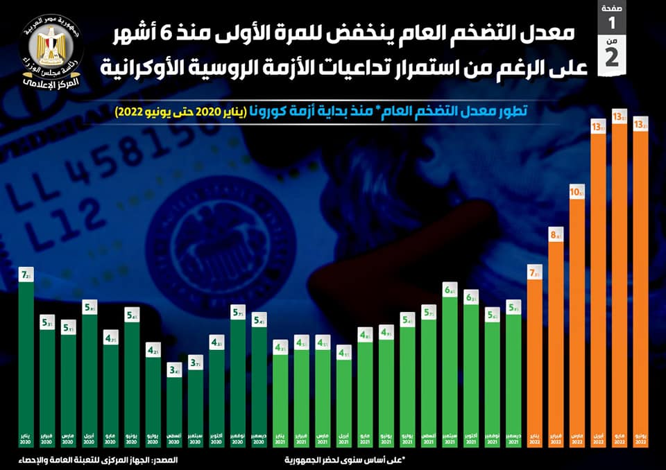 وفي هذا الصدد نشر المركز الإعلامي لمجلس الوزراء تقريراً تضمن إنفوجرافات تسلط الضوء على انخفاض معدل التضخم العام للمرة الأولى منذ 6 أشهر على الرغم من استمرار تداعيات الأزمة الروسية الأوكرانية.