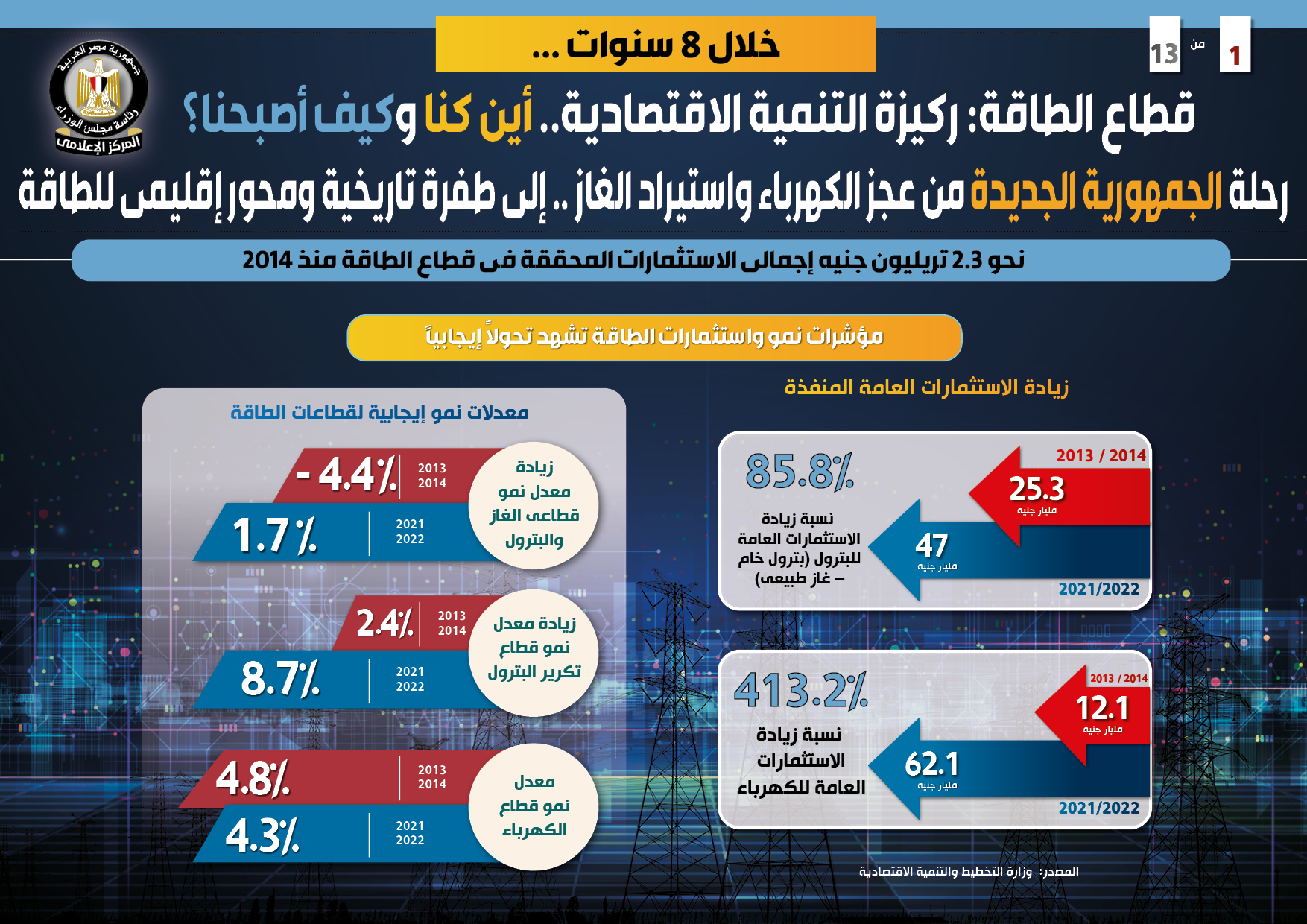 وفي هذا الصدد أصدر المركز الإعلامي لمجلس الوزراء تقريراً تضمن إنفوجرافات تسلط الضوء على قطاع الطاقة كركيزة للتنمية الاقتصادية خلال 8 سنوات، ورحلة الجمهورية الجديدة من عجز الكهرباء واستيراد الغاز إلى طفرة تاريخية ومحور إقليمي للطاقة، حيث بلغ إجمالي الاستثمارات المحققة في القطاع منذ 2014 نحو 2.3 تريليون جنيه، وذلك في إطار سلسلة تقارير “أين كنا وكيف أصبحنا؟”.