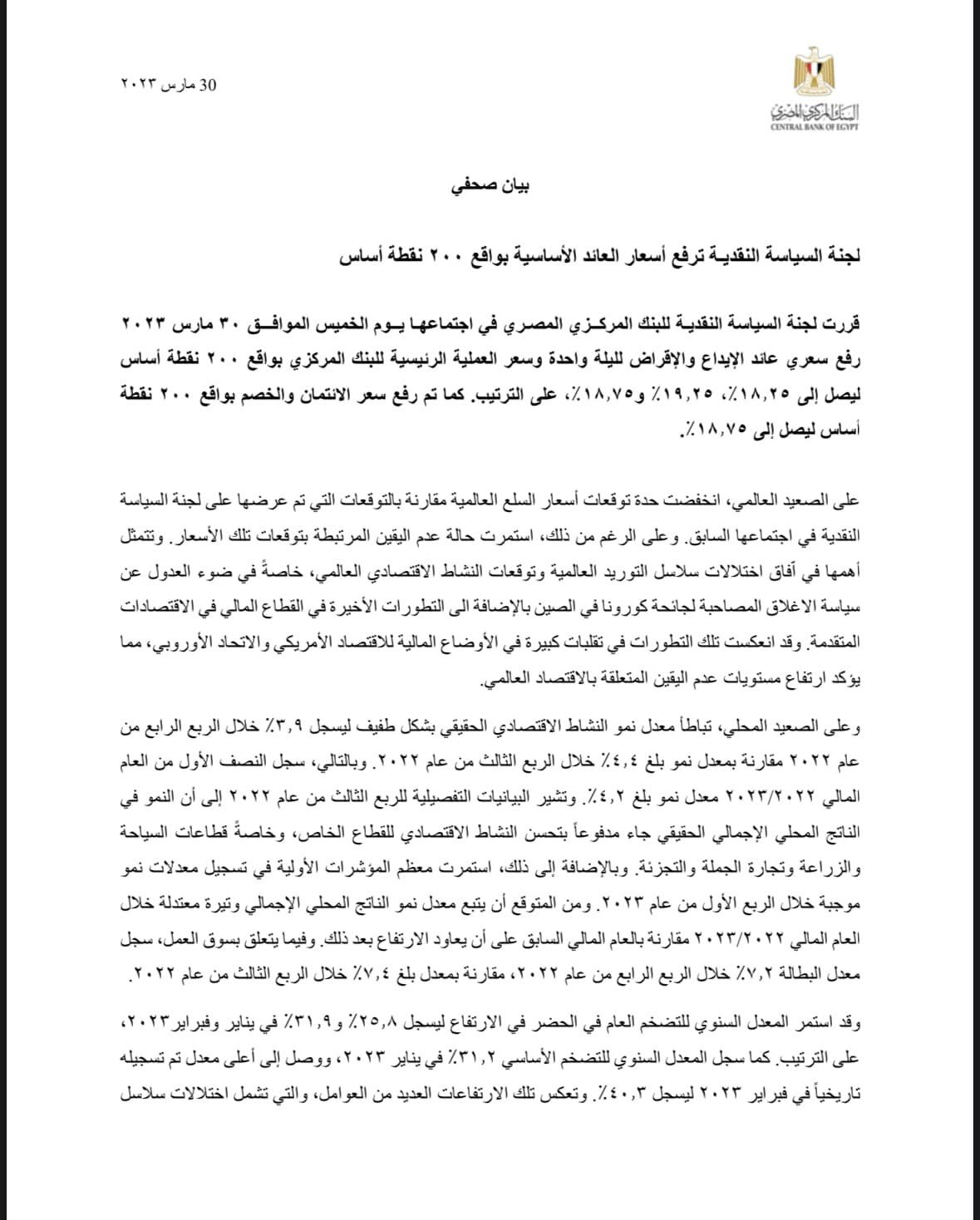 وقال البنك المركزي في بيان اليوم، إن لجنة السياسة النقديـة للبنك المركــزي المصـري قررت في اجتماعهـا يــوم الخميس الموافـــق 30 مارس 2023 رفع سعري عائد الإيداع والإقراض لليلة واحدة وسعر العملية الرئيسية للبنك المركزي بواقع 200 نقطة أساس ليصل إلى 18.25%، 19.25% و18.75%، على الترتيب. كما تم رفع سعر الائتمان والخصم بواقع 200 نقطة أساس ليصل إلى 18.75%.