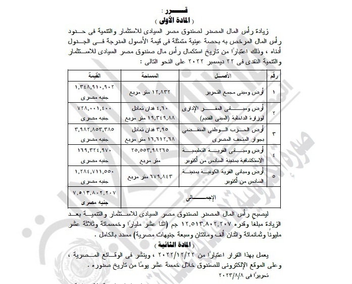 ونصت المادة الأولى من القرار على زيادة رأس المال المصدر لصندوق مصر السيادي للاستثمار والتنمية في حدود رأس المال المرخص به بحصة عينية متمثلة في قيمة الأصول المدرجة في الجدول، وذلك اعتبارًا من تاريخ استكمال رأس مال صندوق مصر السيادي للاستثمار والتنمية النقدي في 22 ديسمبر 2022.