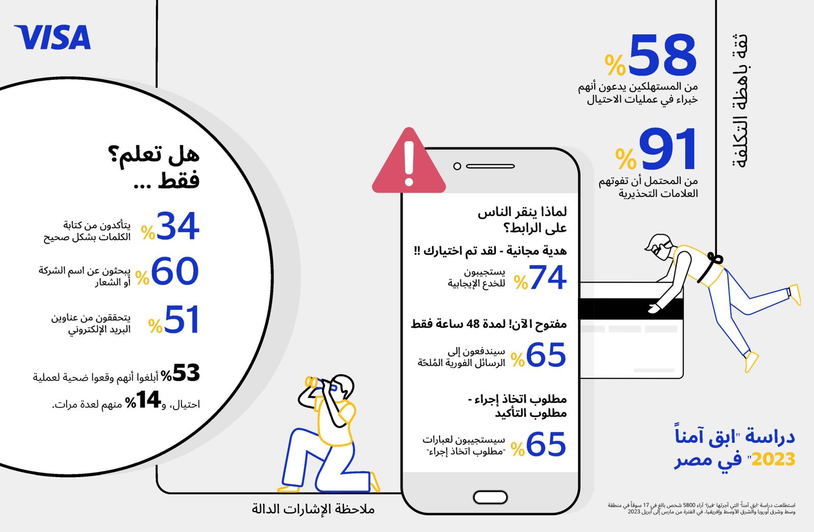 وتوصلت دراسة فيزا “ابق آمنًا” لعام 2023 إلى أن أكثر من نصف الأشخاص في مصر قد كانوا ضحايا لعملية احتيال لمرة واحدة على الأقل 53٪ مقارنة بالمعدل العالمي البالغ 52٪ وقد أجرت شركة ويكفيلد للبحوث الدراسة في بلدان منطقة وسط وشرق أوروبا والشرق الأوسط وأفريقيا (CEMEA). والأمر الأكثر إثارة للقلق هو النتيجة بأن نسبة 14٪ من الضحايا تعرضوا للخداع عدة مرات في مقابل المتوسط العالمي البالغ 15٪.