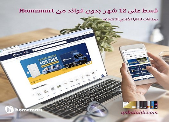 ويتيح البنك لعملائه تقسيط فرش المنزل من Homzmart أونلاين على 12 شهراً بدون فوائد وبدون مصاريف إدارية، وذلك عند الدفع ببطاقات QNB الأهلي الائتمانية.