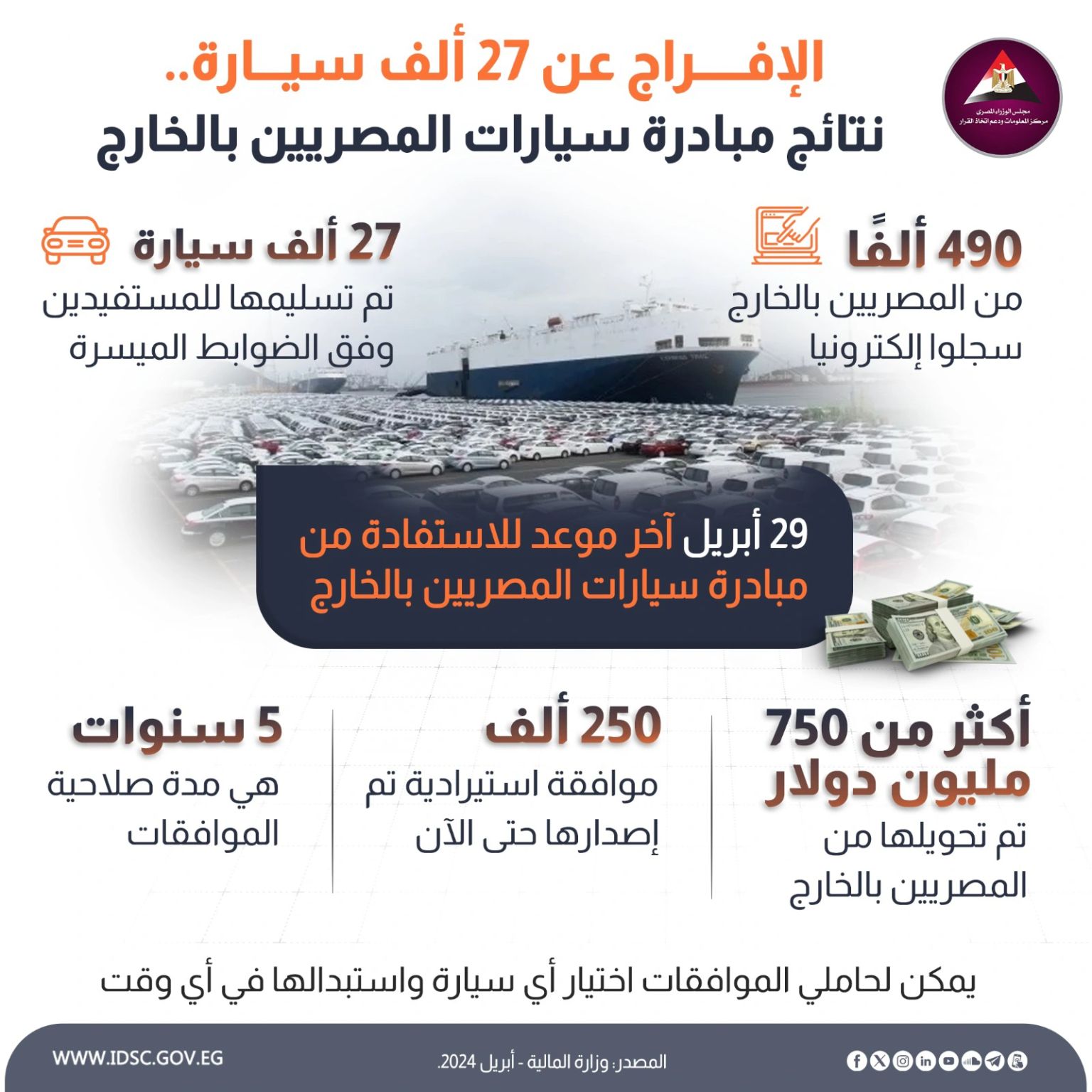 وأعلن الدكتور محمد معيط، وزير المالية، أن آخر موعد للتسجيل في مبادرة استيراد سيارات المصريين بالخارج يوم 29 أبريل الجاري، لافتًا إلى أنه تم الإفراج عن 27 ألف سيارة حتى الآن مع استمرار فحص باقي الطلبات التي تم تقديمها.