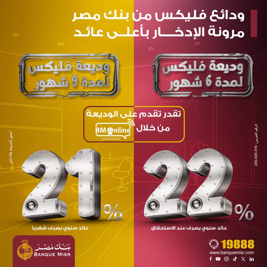 شارك بنك مصر، عبر صفحته الرسمية على موقع التواصل الاجتماعي Facebook تفاصيل مزايا ودائع فليكس لمدة 6 و 9 أشهر، والتي يصل عائدها إلى 22% سنويا.