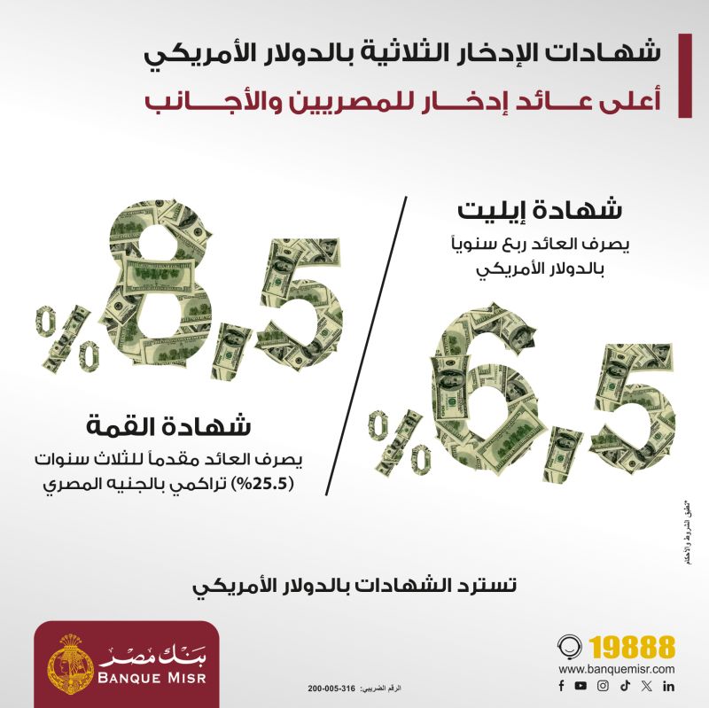 بنك مصر يعدّل سعر العائد على شهادتي ادخار «القمة» و«إيليت» الثلاثية بالدولار