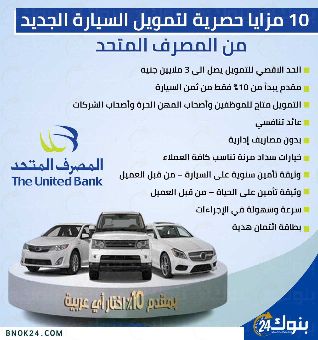 وفي الـ «إنفوجرافيك» التالي تعرض بوابة (بنوك 24) مزايا تمويل السيارة الجديد من المصرف المتحد.
