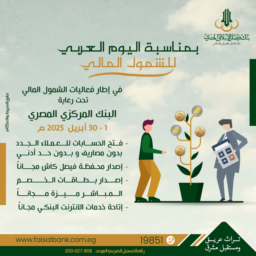 أعلن بنك فيصل الإسلامي المصري عن مشاركته في فعاليات الشمول المالي بمناسبة اليوم العربي للشمول المالي وتحت رعاية البنك المركزي المصري.