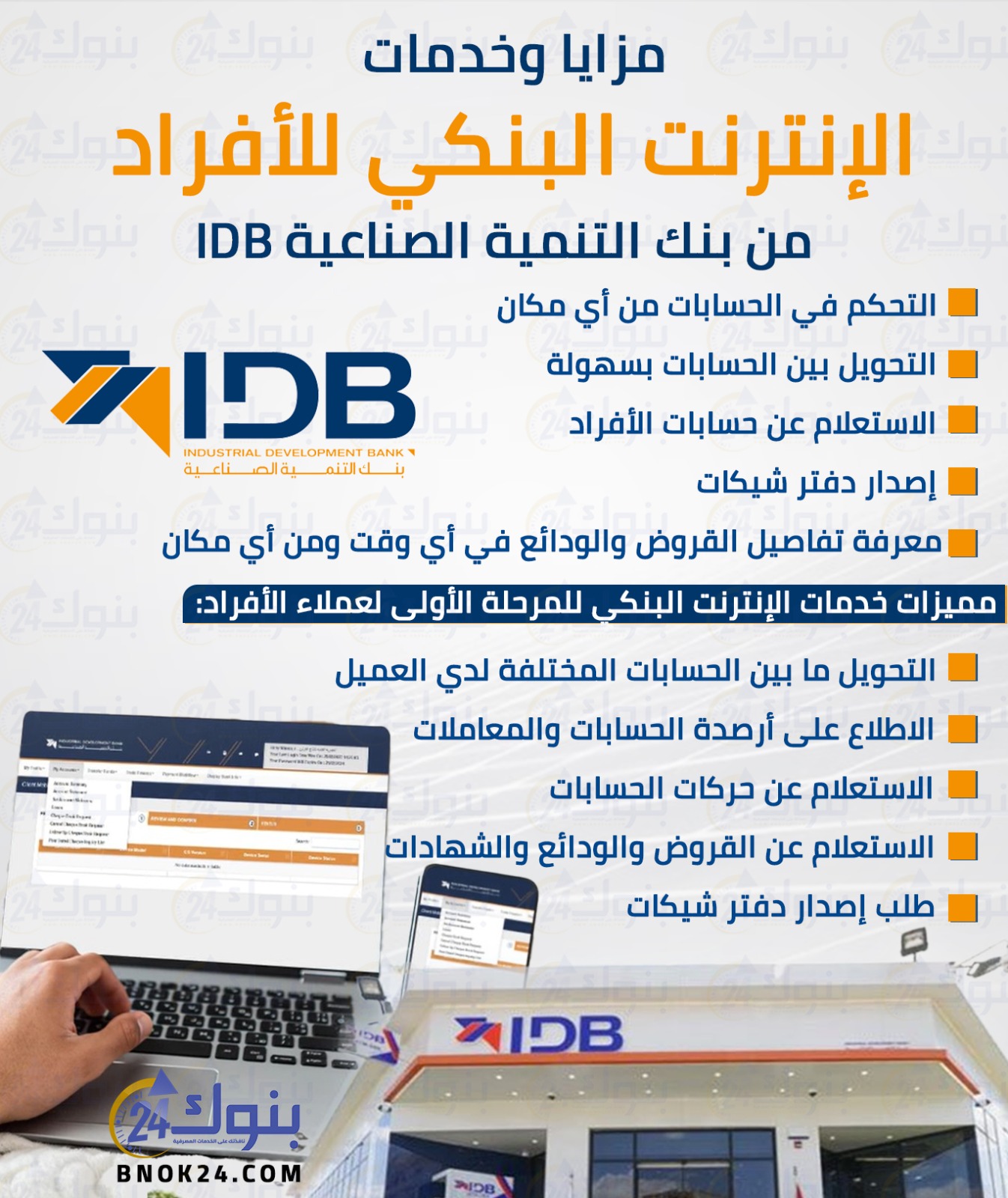 ومن هذه الخدمات يقدم البنك خدمة الإنترنت البنكي للأفراد التي تتيح لهم التحكم في حساباتهم من أي مكان عبر خدمات الإنترنت البنكي من IDB.