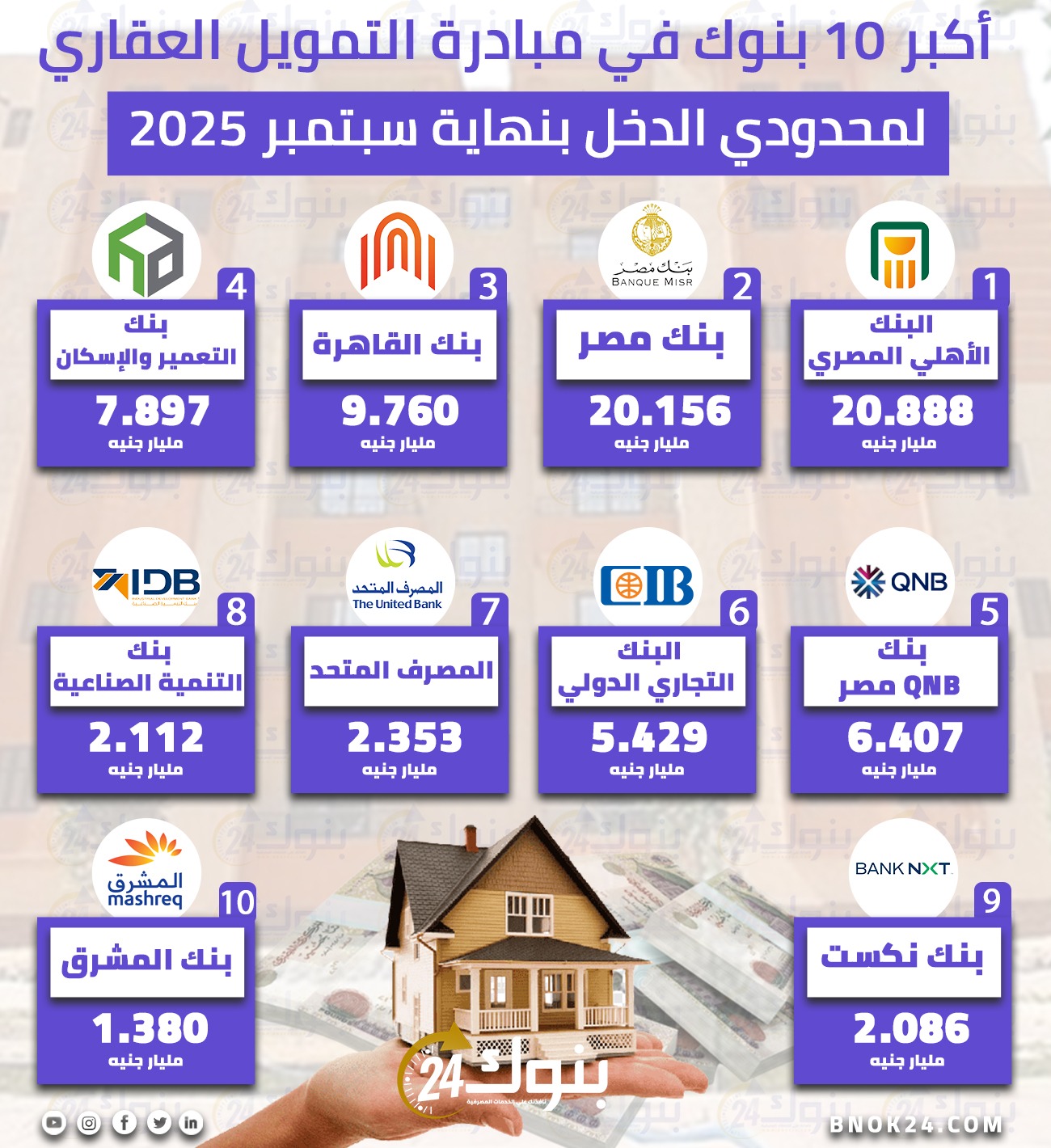 أكبر 10 بنوك في مبادرة التمويل العقاري لمحدودي الدخل بنهاية سبتمبر 2025 «إنفوجرافيك»