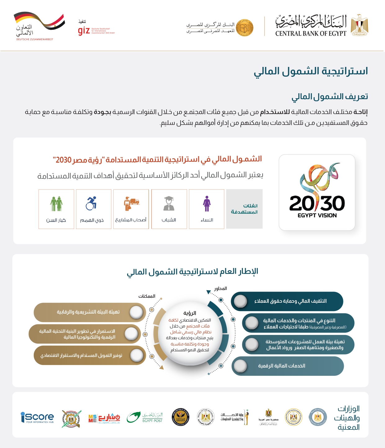 تجدر الإشارة إلى أن استراتيجية البنك المركزي المصري للشمول المالي للفترة 2022-2025 تعتمد على أسس علمية دقيقة لقياس معدلات الشمول المالي على مستوى الجمهورية، سواء من حيث الإتاحة أو الاستخدام أو جودة الخدمات المالية، وترتكز الاستراتيجية على مجموعة من المحاور الرئيسية والممكنات لتحقيق أهدافها، من بينها تنويع المنتجات والخدمات المالية (المصرفية أو غير المصرفية) بما يتلاءم مع احتياجات مختلف شرائح العملاء، فضلاً عن تهيئة البيئة التشريعية والرقابية لتضمن شمول كافة فئات المجتمع في النظام المالي الرسمي.