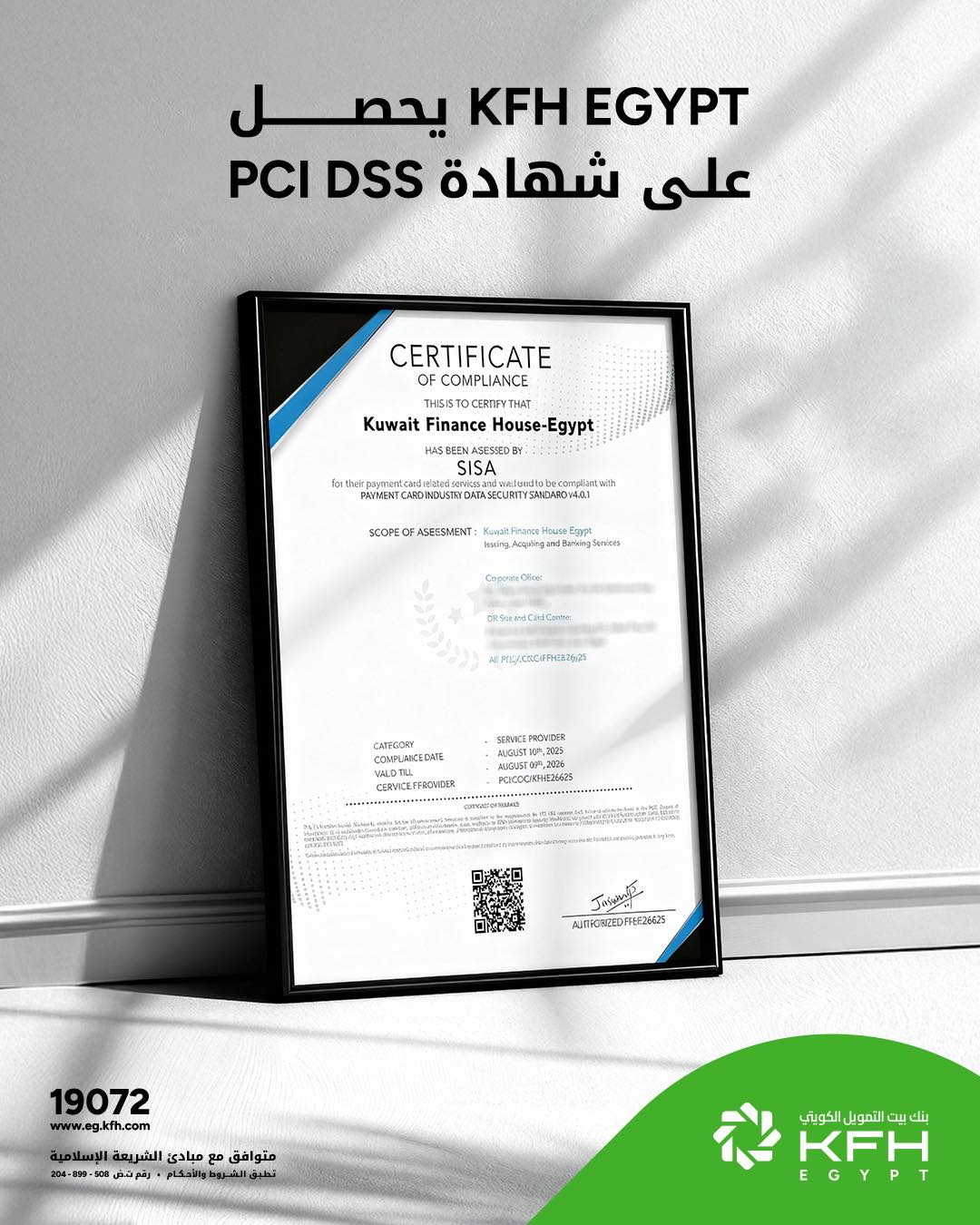 بنك بيت التمويل الكويتي مصر يحتفظ بشهادة PCI DSS V4.0.1 التي تضمن أعلى معايير الحماية والأمان العالمية
