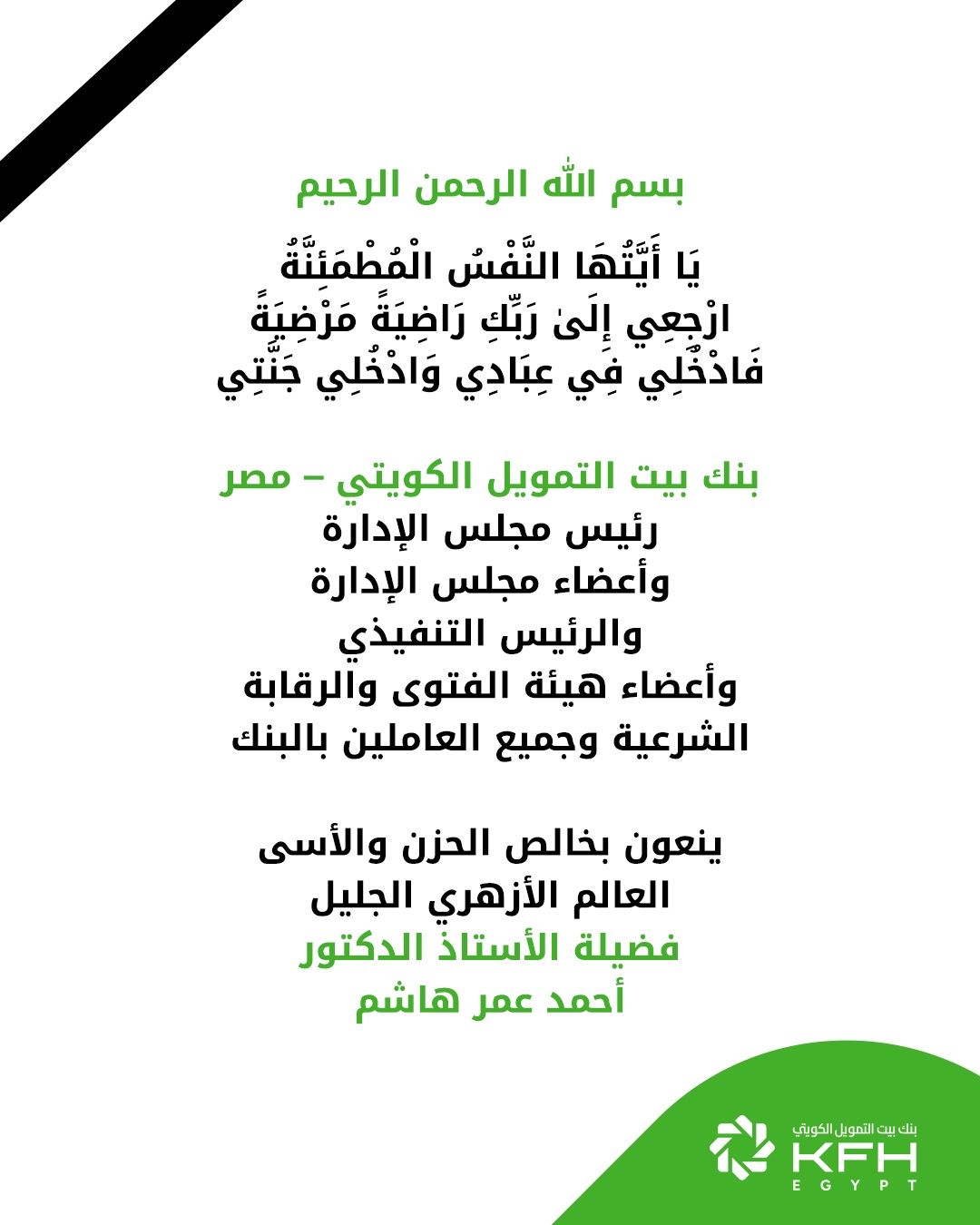 بنك بيت التمويل الكويتي – مصر ينعي الدكتور أحمد عمر هاشم