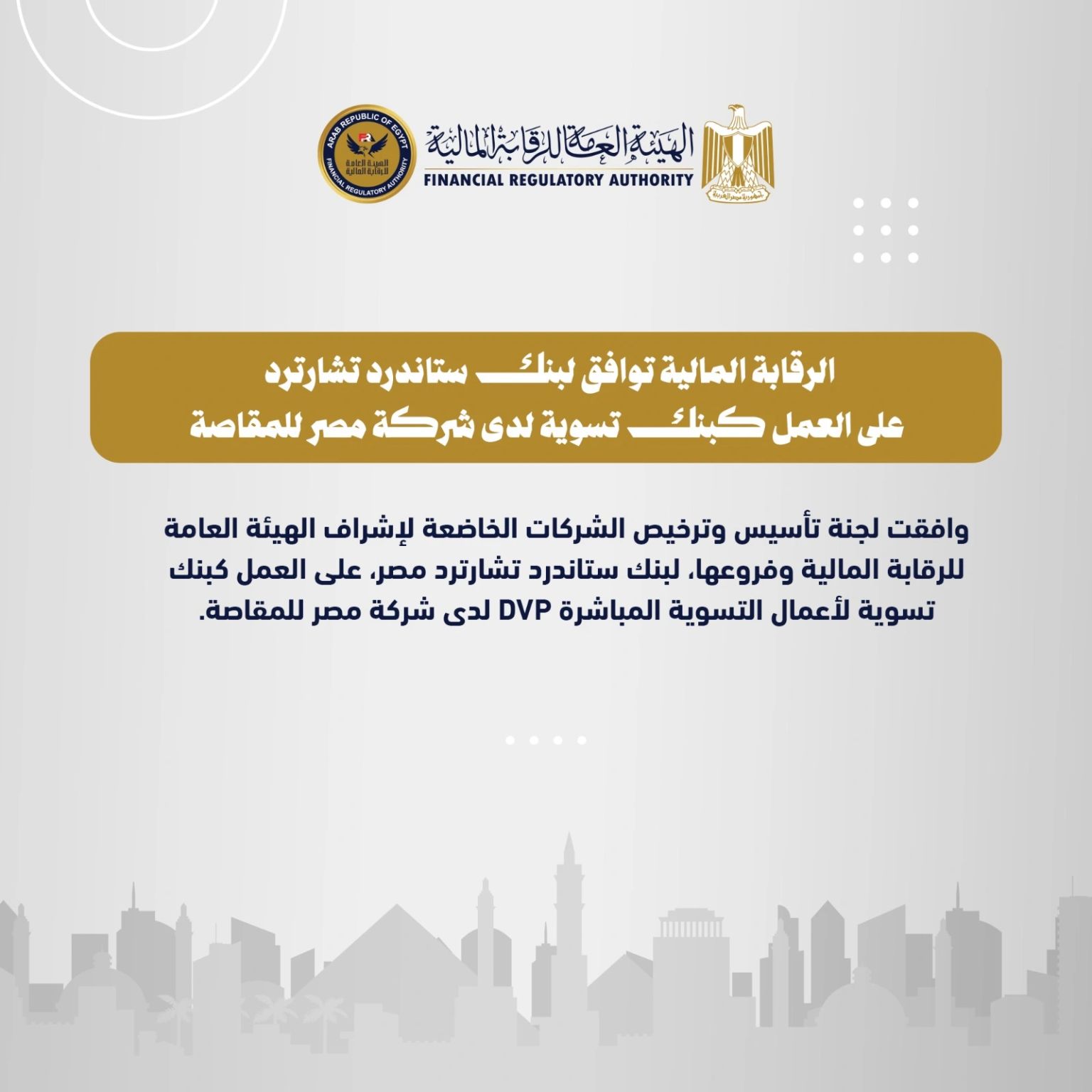 أعلنت الهيئة العامة للرقابة المالية عن موافقة لجنة تأسيس وترخيص الشركات الخاضعة لإشراف الهيئة العامة للرقابة المالية وفروعها، لبنك ستاندرد تشارترد مصر، على العمل كبنك تسوية لأعمال التسوية المباشرة DVP لدى شركة مصر للمقاصة.