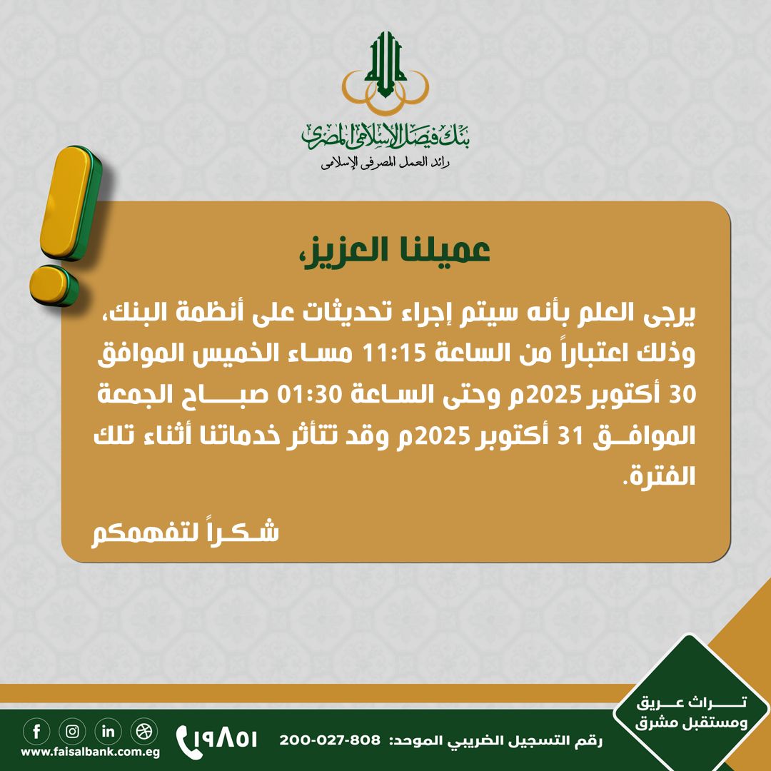 أعلن بنك فيصل الإسلامي المصري أنه سيقوم بإجراء بعض التحديثات على الأنظمة التشغيلية للبنك غداً الخميس الموافق 31 أكتوبر 2025.
