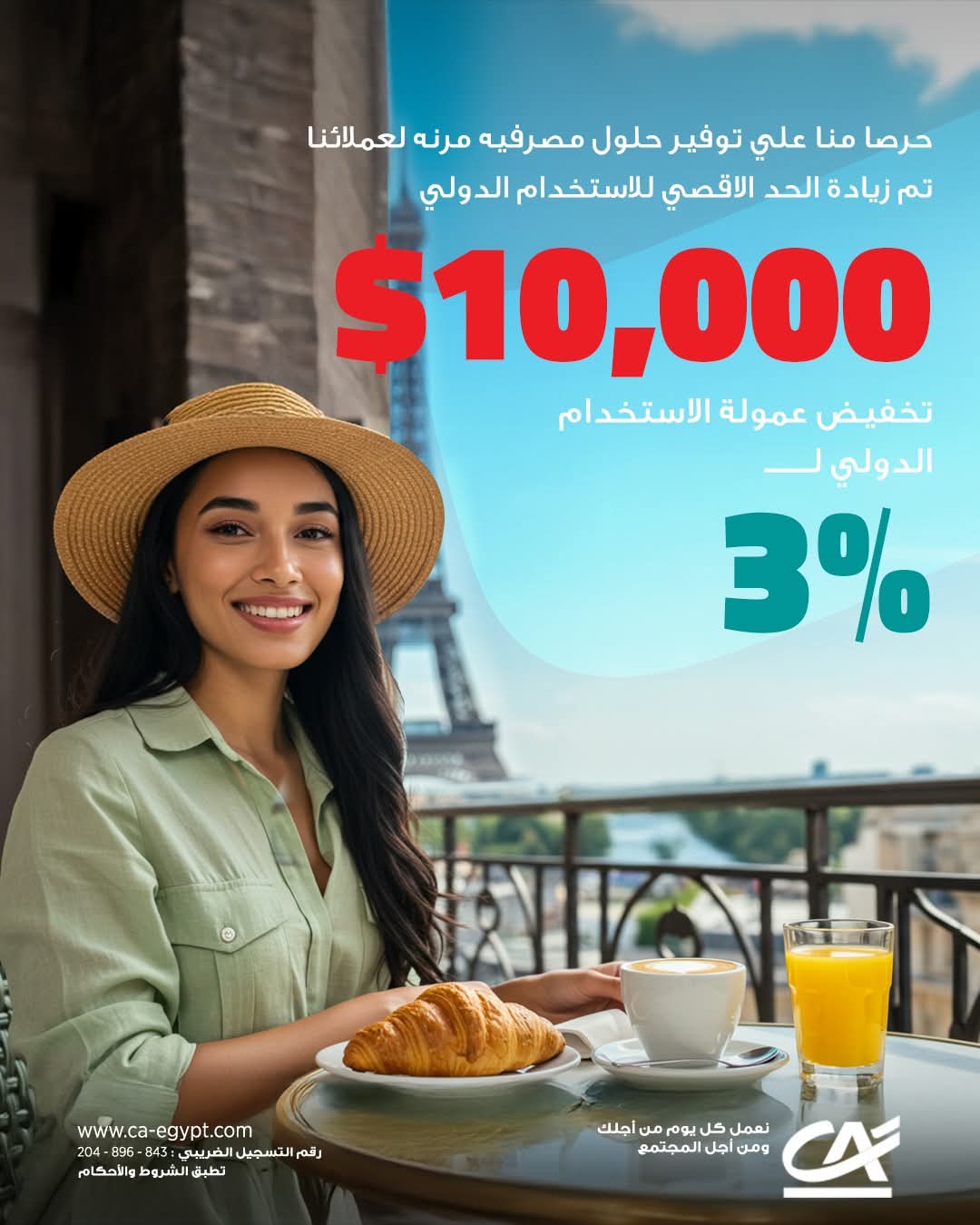 بنك كريدي أجريكول مصر يتيح استخدام بطاقاته الائتمانية خارج مصر بحدود أكبر بعمولة 3%