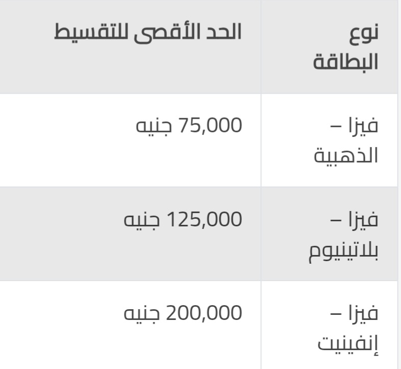–  لا يوجد حد أقصى لعدد المعاملات للتقسيط ولكن يوجد حد أقصى لإجمالي المبالغ حسب نوع البطاقة كما هو موضح بالجدول السابق.