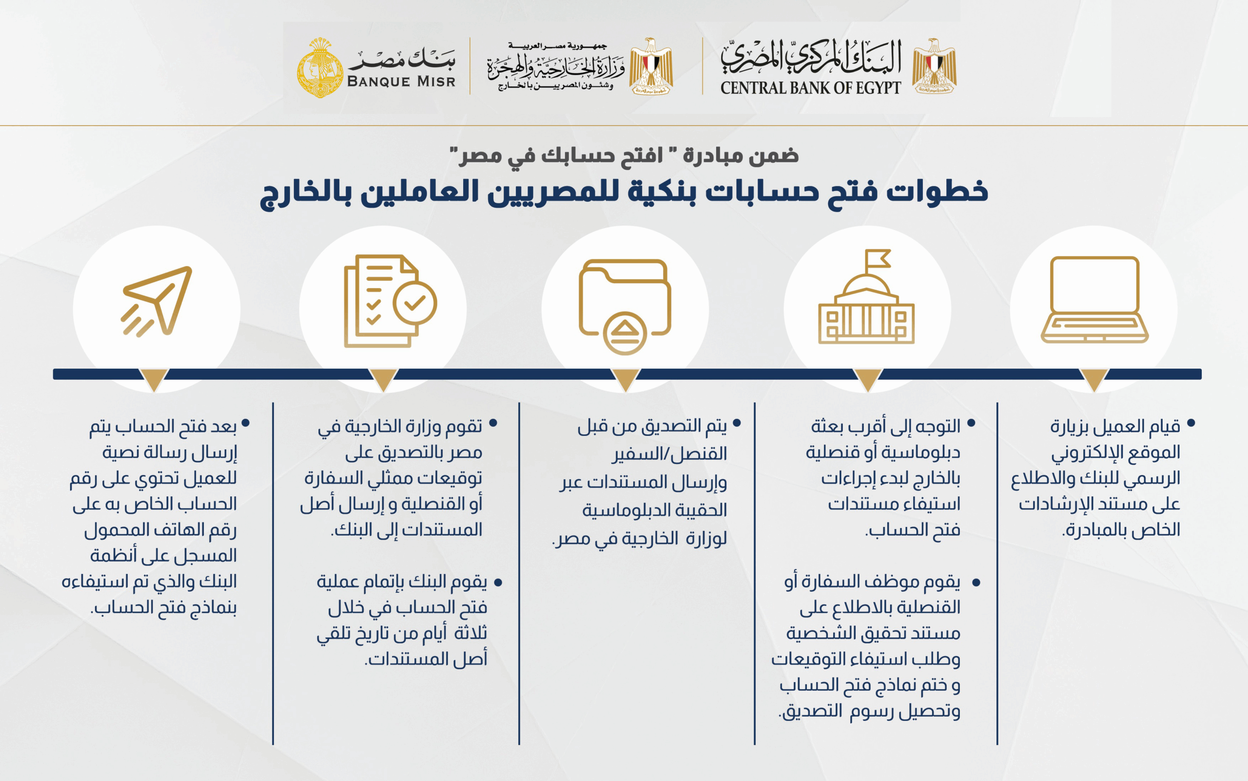وأوضح بنك مصر خطوات فتح حسابات بنكية للمصريين العاملين بالخارج، ضمن مبادرة افتح حسابك في مصر، وهي كالتالي: