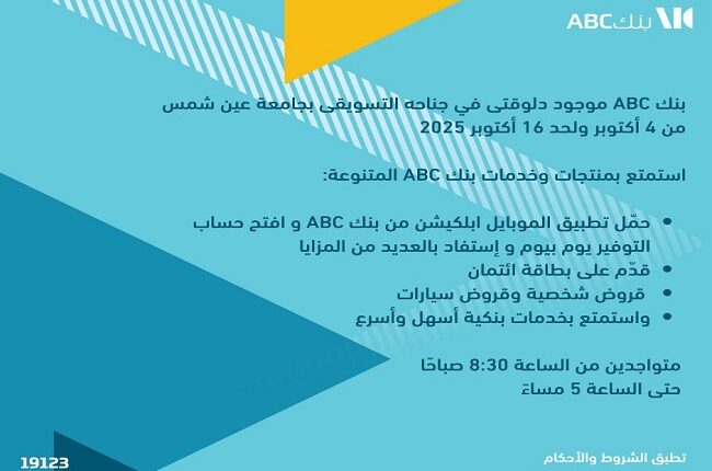 بنك ABC مصر ينظم جناحاً تسويقياً في جامعة عين شمس حتى 16 أكتوبر 2025