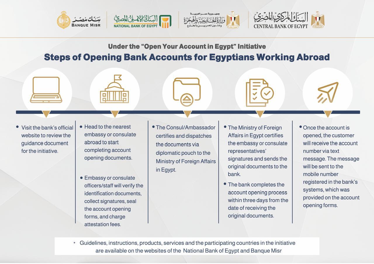 تتيح المبادرة للمصريين العاملين بالخارج إمكانية فتح حسابات مصرفية في البنك الأهلي المصري أو بنك مصر، من خلال التوجه إلى أقرب مقر بعثة دبلوماسية أو قنصلية مصرية بالخارج، لاستيفاء النموذج الخاص بفتح الحساب والتوقيع عليه ثم التصديق عليه من جانب السفارة أو القنصلية التي ستتولى إرساله إلى ديوان وزارة الخارجية لمتابعة توثيق الأوراق ثم تسليمها إلى البنكين.