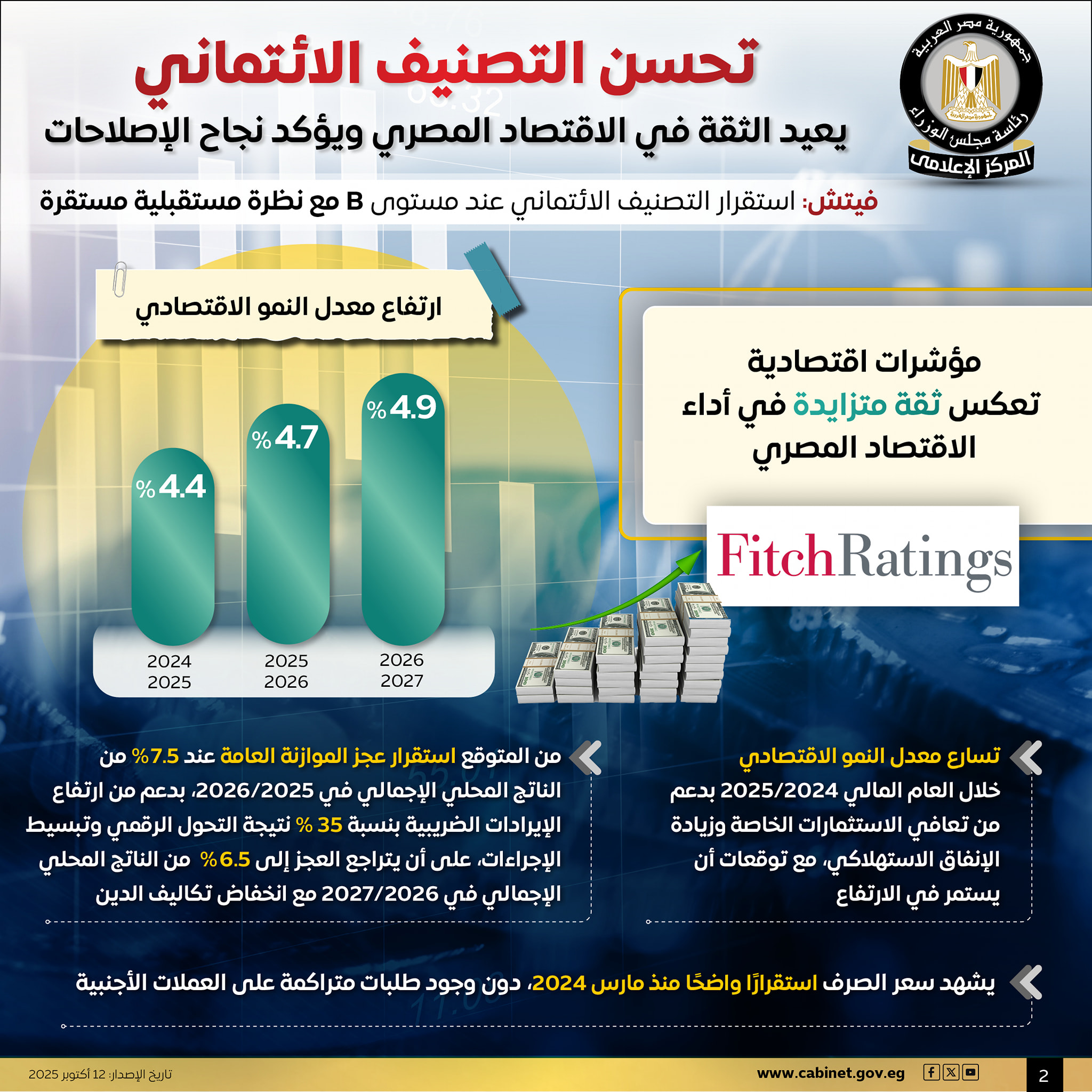 نشر المركز الإعلامي لمجلس الوزراء عددًا من الإنفوجرافات عبر منصاته على مواقع التواصل الاجتماعي، سلط من خلالها الضوء على تحسن التصنيف الائتماني للاقتصاد المصري، بما يعكس نجاح الإصلاحات الاقتصادية التي تنتهجها الدولة.