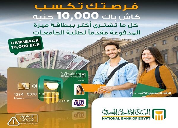 – احصل على 10 آلاف جنيه استرداد نقدي عند إجراء أعلى عدد لمعاملات المشتريات والتسوق عبر الإنترنت ببطاقة ميزة المدفوعة مقدمًا الموحدة لطلبة الجامعات من البنك الأهلي المصري.