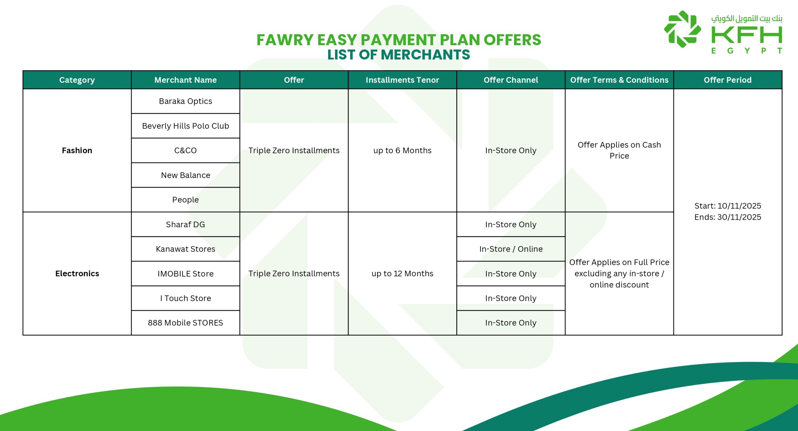 ويتيح البنك لعملائه حتى نهاية نوفمبر 2025 إمكانية تقسيط المشتريات حتى 6 أشهر بدون أرباح عند الدفع ببطاقات بنك بيت التمويل الكويتي – مصر الائتمانية من خلال ماكينات فوري.
