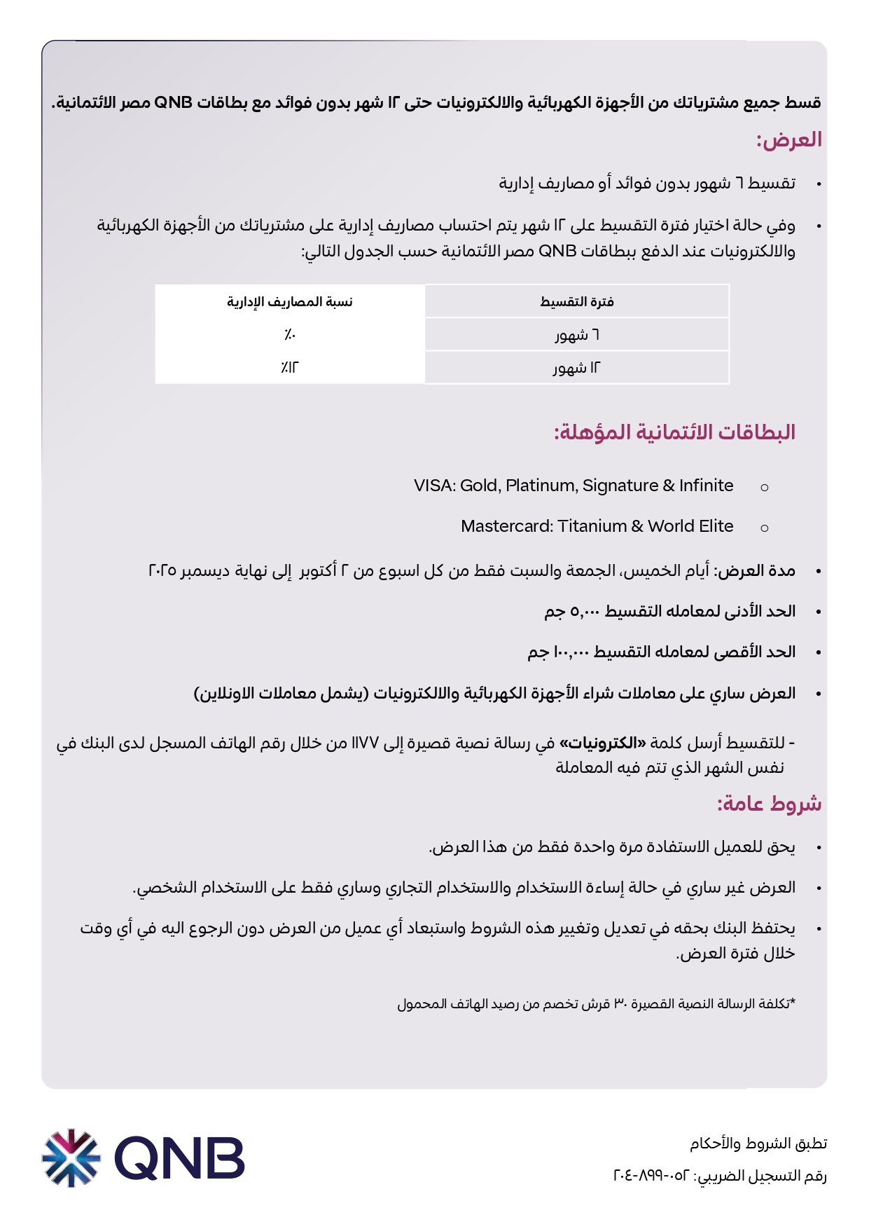 ويتيح البنك للعملاء تقسيط الأجهزة الكهربائية والإلكترونية حتى 12 شهراً بدون فوائد، وذلك عند الدفع ببطاقات QNB مصر الائتمانية.