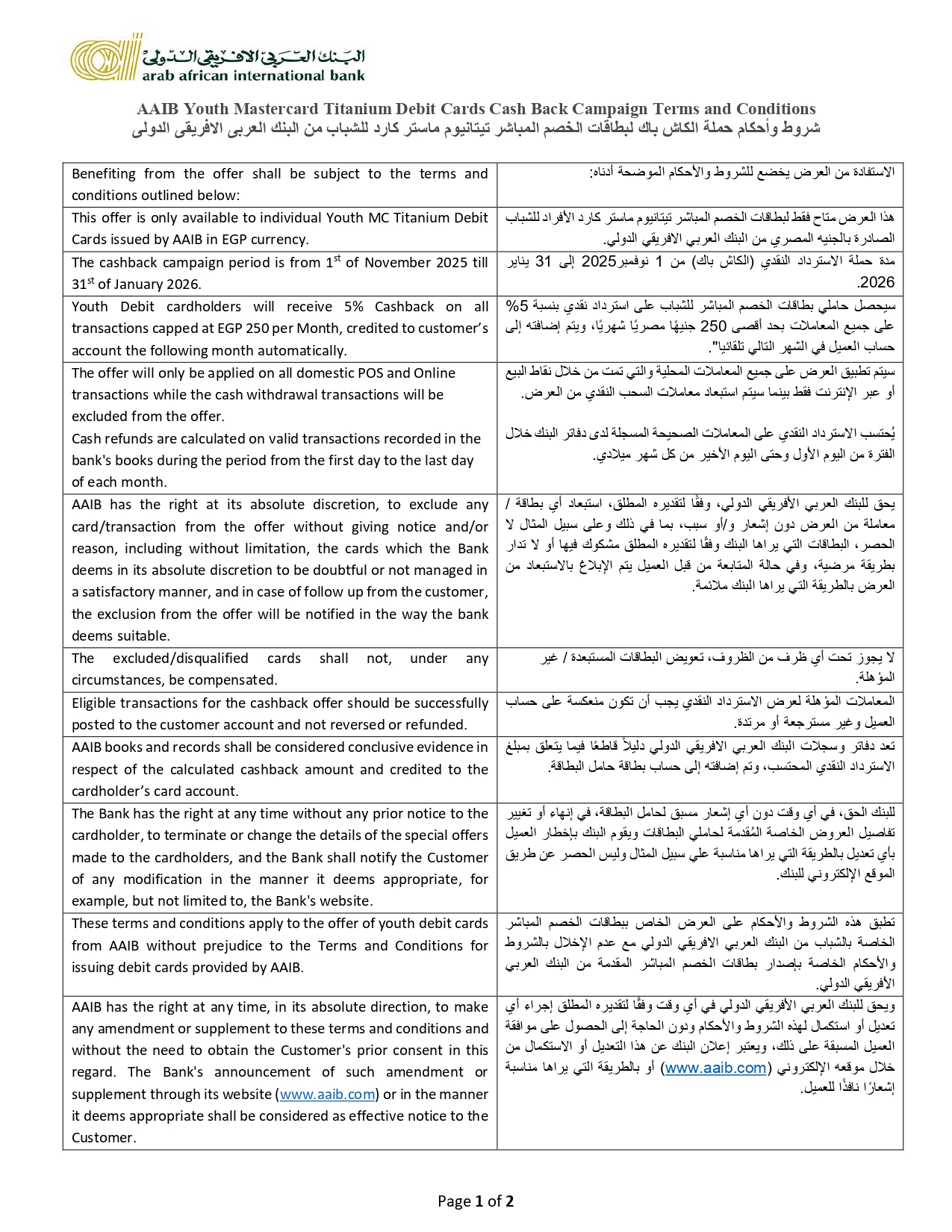 ويتيح البنك للعملاء فرصة الحصول على 5% كاش باك بحد أقصى 250 جنيهاً على المشتريات عند الدفع بطاقة الخصم المباشر للشباب من البنك العربى الافريقى الدولى.