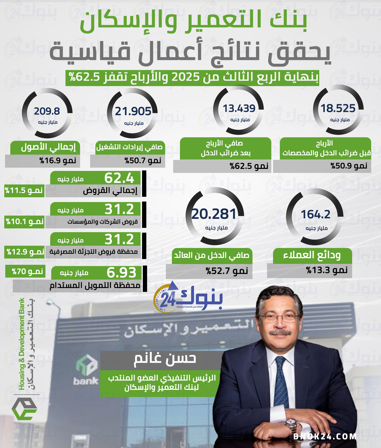 بنك التعمير والإسكان يحقق نتائج أعمال قياسية بنهاية الربع الثالث من 2025 والأرباح تقفز 62.5% «إنفوجرافيك»