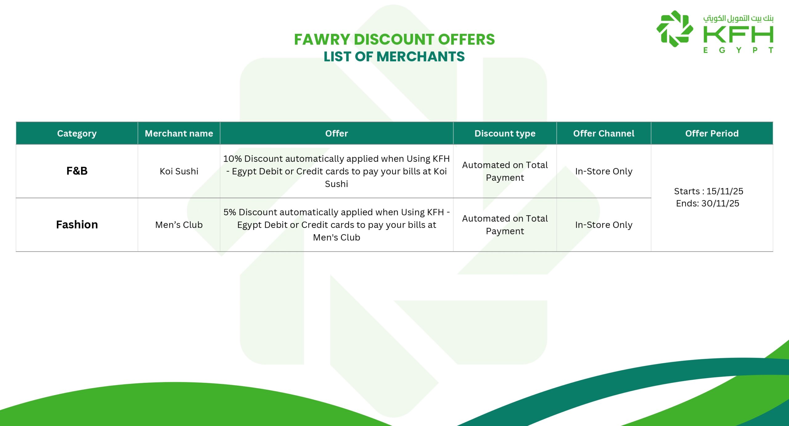 ويتيح بنك KFHEgypt لعملائه فرصة شراء الملابس من Men’s Club ببطاقات بنك بيت التمويل الكويتي – مصر الائتمانية والحصول على خصم 5% عند الدفع من خلال ماكينات فوري.