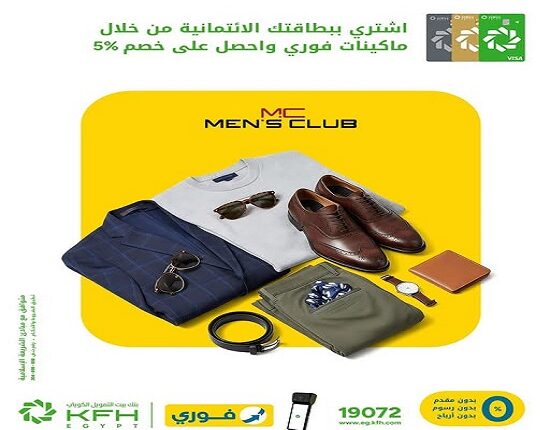 ويتيح بنك KFHEgypt لعملائه فرصة شراء الملابس من Men’s Club ببطاقات بنك بيت التمويل الكويتي – مصر الائتمانية والحصول على خصم 5% عند الدفع من خلال ماكينات فوري.