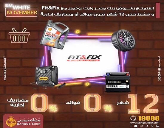ويتيح بنك مصر للعملاء فرصة تقسيط المشتريات من Fit&Fix على 12 شهرًا بدون فوائد أو مصاريف إدارية عند الدفع ببطاقات بنك مصر الائتمانية.