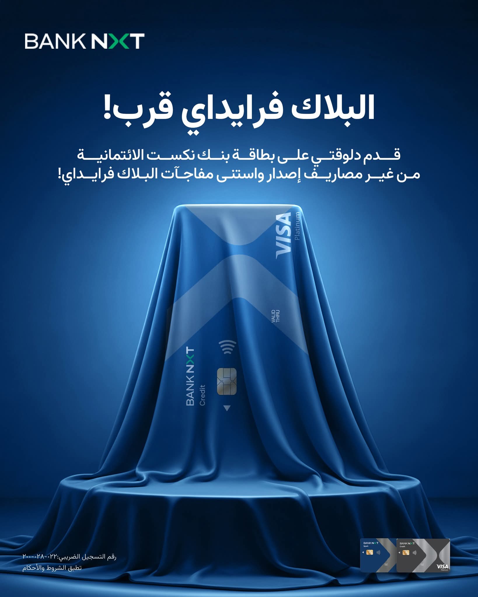 أعلن بنك نكست NXT عبر صفحته الرسمية على موقع التواصل الاجتماعي Facebook عن أحدث عروضه للعملاء بمناسبة الاستعداد لعروض البلاك فرايداي، إذ يتيح البنك فرصة التقديم على البطاقة الائتمانية بدون مصاريف.
