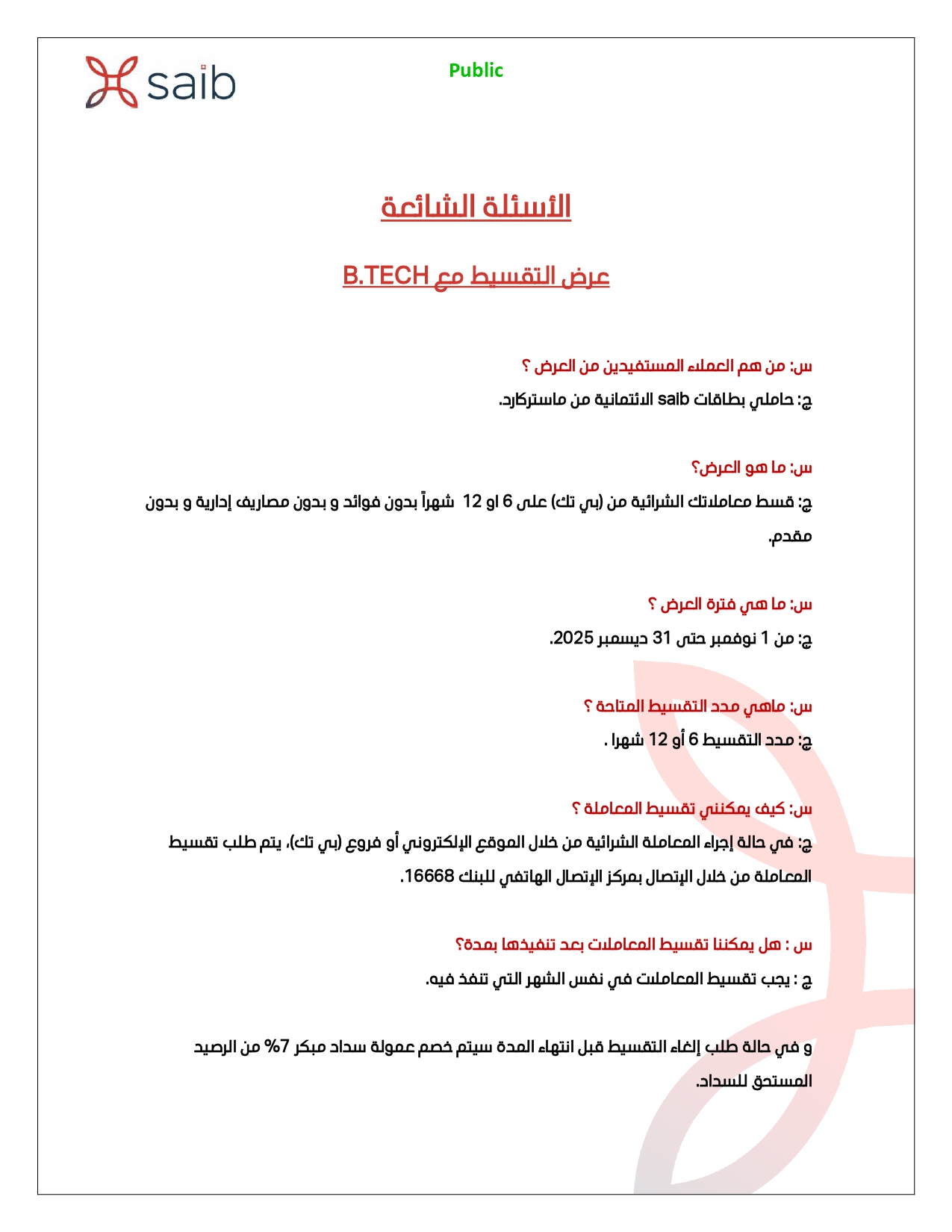 ويتيح البنك للعملاء إمكانية تقسيط المشتريات من B.TECH ببطاقة saib الائتمانية من ماستركارد حتى 12 شهراً بدون فوائد، أو مقدم أو مصاريف إدارية.