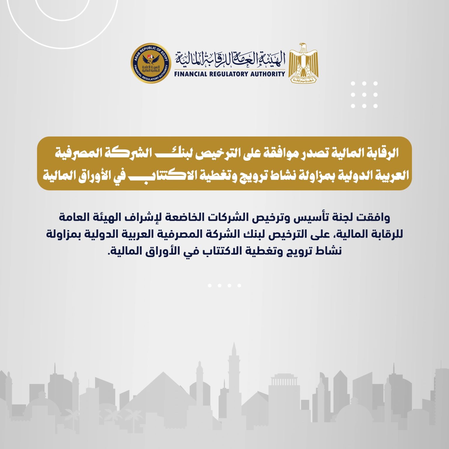 وافقت لجنة تأسيس وترخيص الشركات الخاضعة لإشراف الهيئة العامة للرقابة المالية، على منح الترخيص لبنك الشركة المصرفية العربية الدولية – saib، بمزاولة نشاط ترويج وتغطية الاكتتابات في الأوراق المالية.