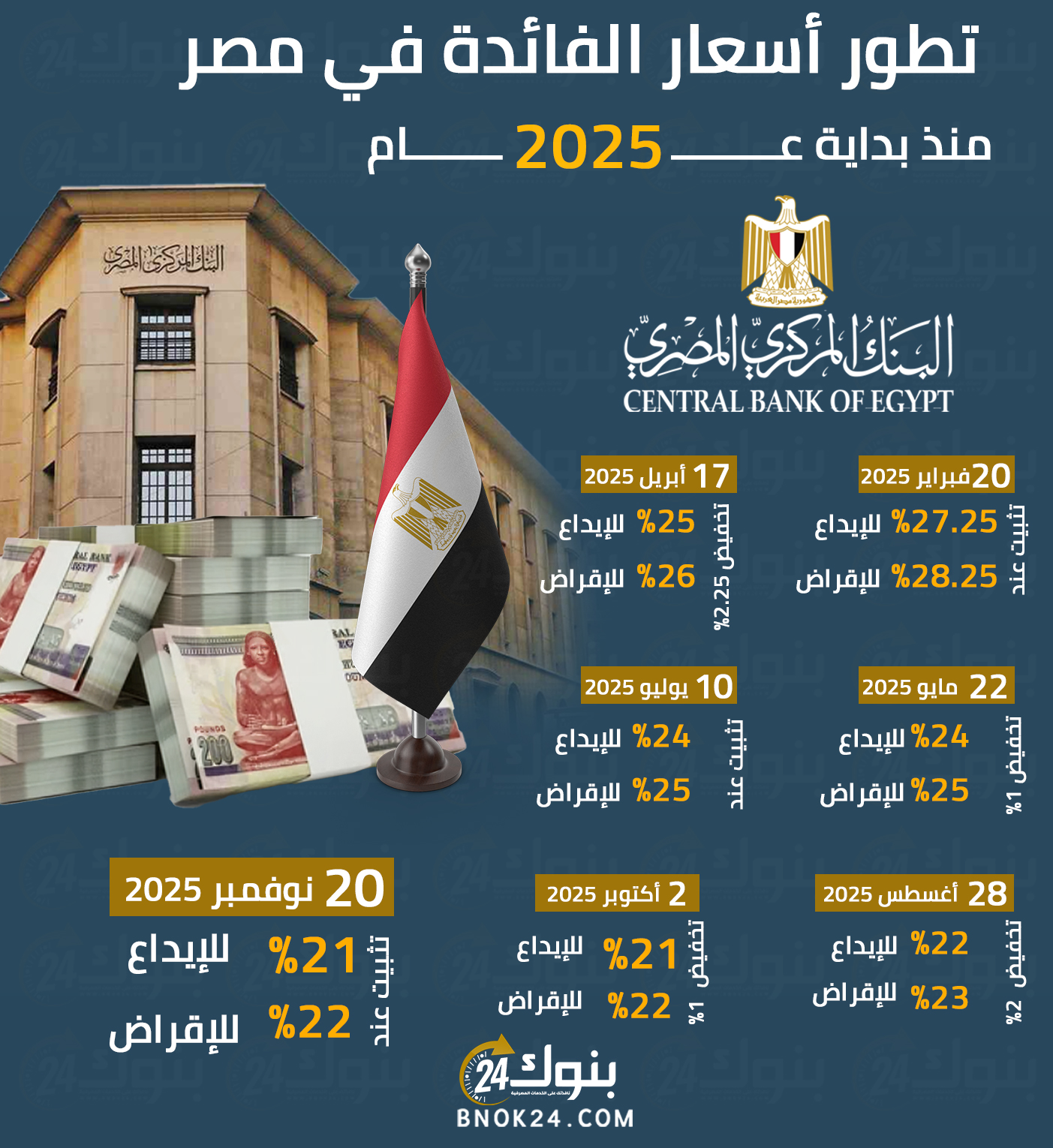 وتستعرض بوابة (بنوك 24) في الإنفوجرافيك التالي تطور أسعار الفائدة في مصر خلال عام 2025 بعد القرار الأخير.