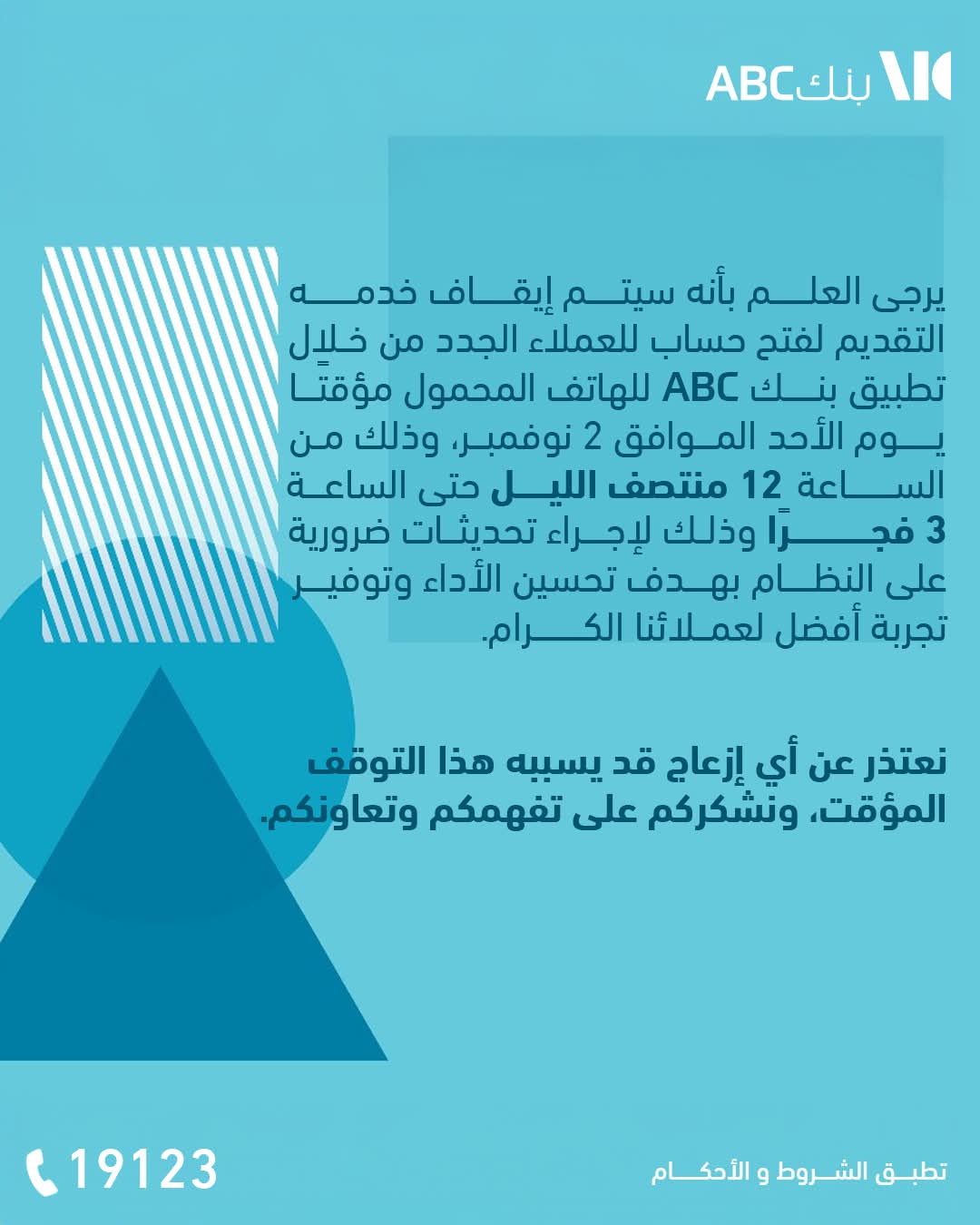 تنويه هام من بنك ABC عن خدمة فتح الحسابات الجديدة للعملاء عبر تطبيق الهاتف المحمول