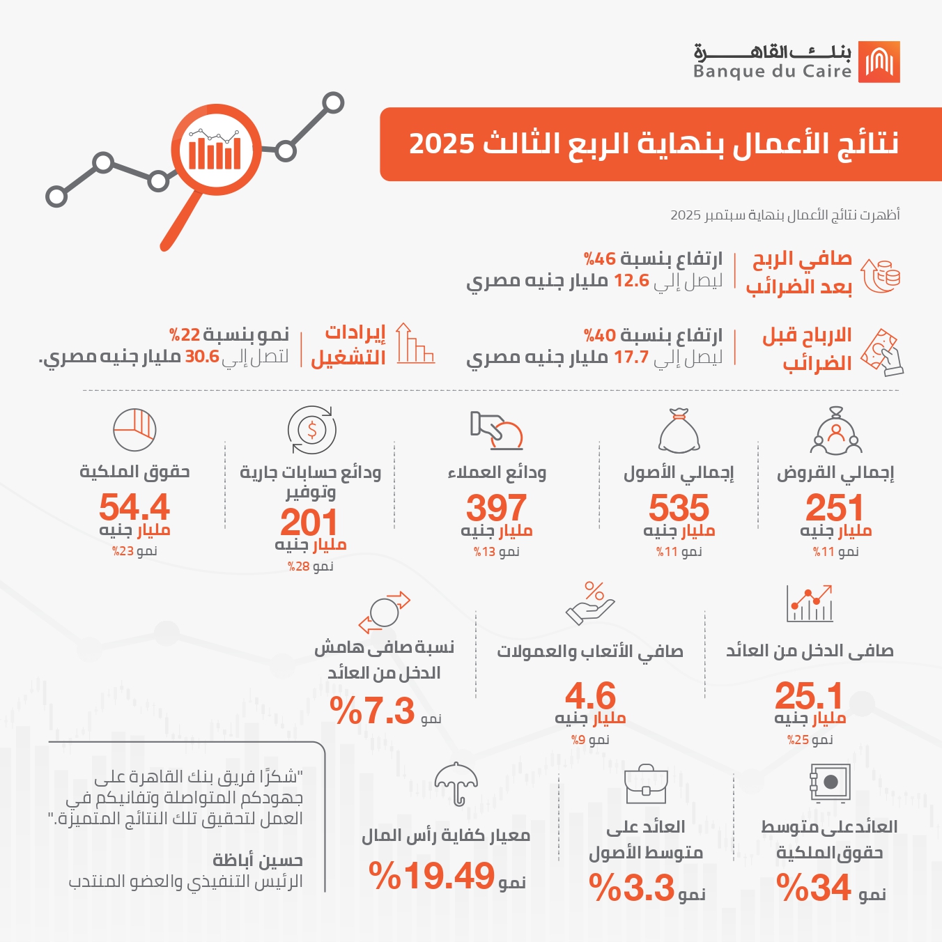 حقق بنك القاهرة أداءاً إيجابيًا خلال التسعة أشهر الأولى من عام 2025، محققاً نموًا في صافي أرباحه بنسبة 46% مقارنة بنفس الفترة من العام الماضي.