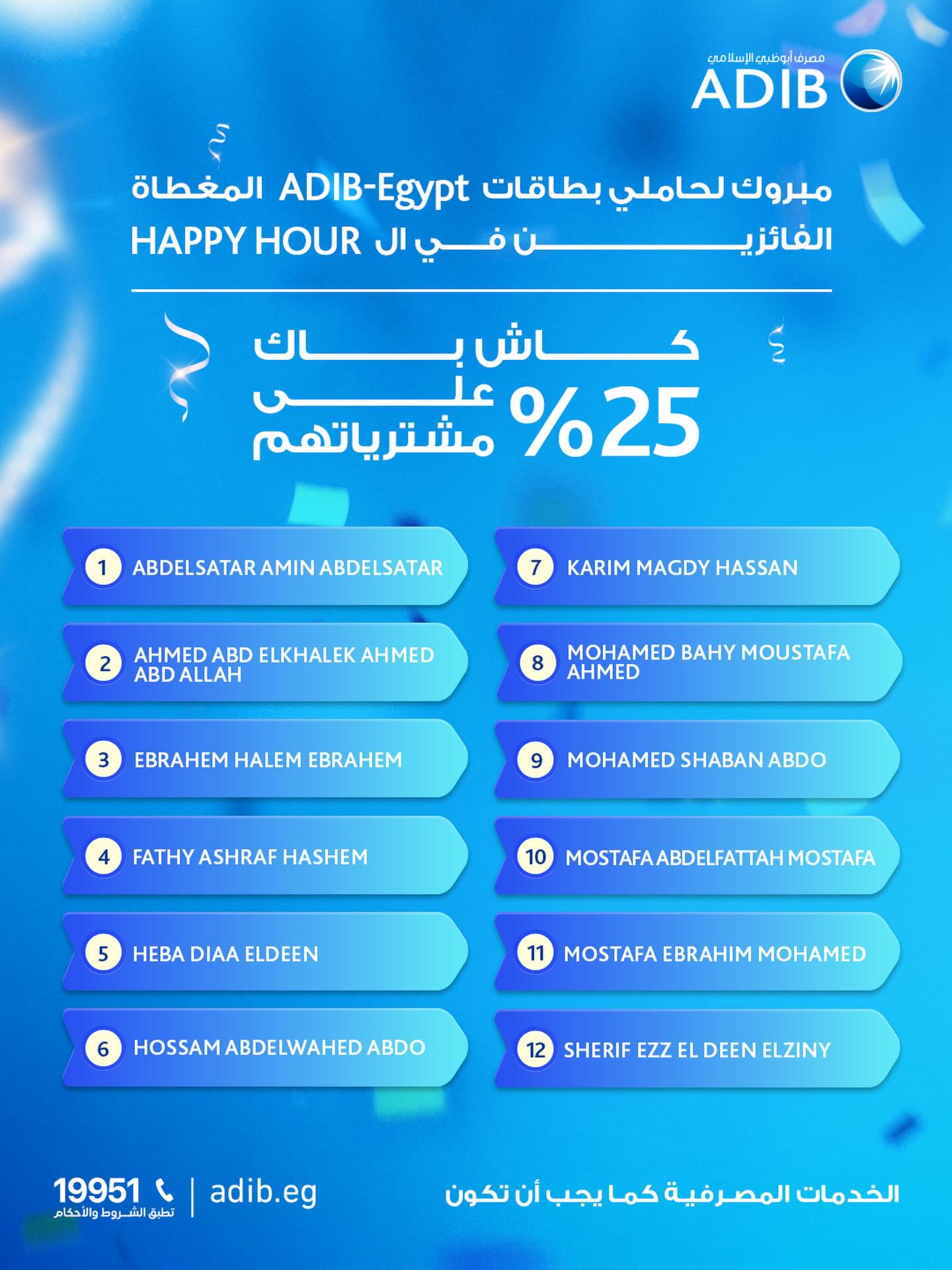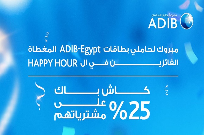 أعلن مصرف أبوظبي الإسلامي- مصر، عبر صفحته الرسمية على موقع التواصل الاجتماعي فيسبوك، عن أسماء عملائه حاملي بطاقات ADIB-Egypt المغطاة الفائزين بكاش باك 25% على مشترياتهم في الـ Happy Hour.