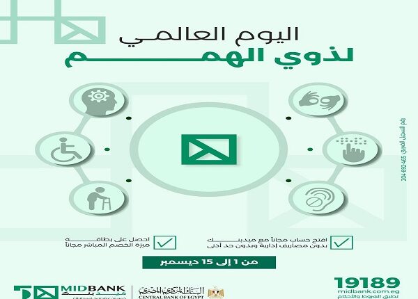 واحتفالاً باليوم العالمي لذوي الهمم وفي إطار فعاليات الشمول المالي، تحت رعاية البنك المركزي المصري، يتيح ميدبنك للعملاء فتح حساب بدون مصاريف إدارية وبدون حد أدنى والحصول على بطاقة ميزة الخصم المباشر مجاناً.