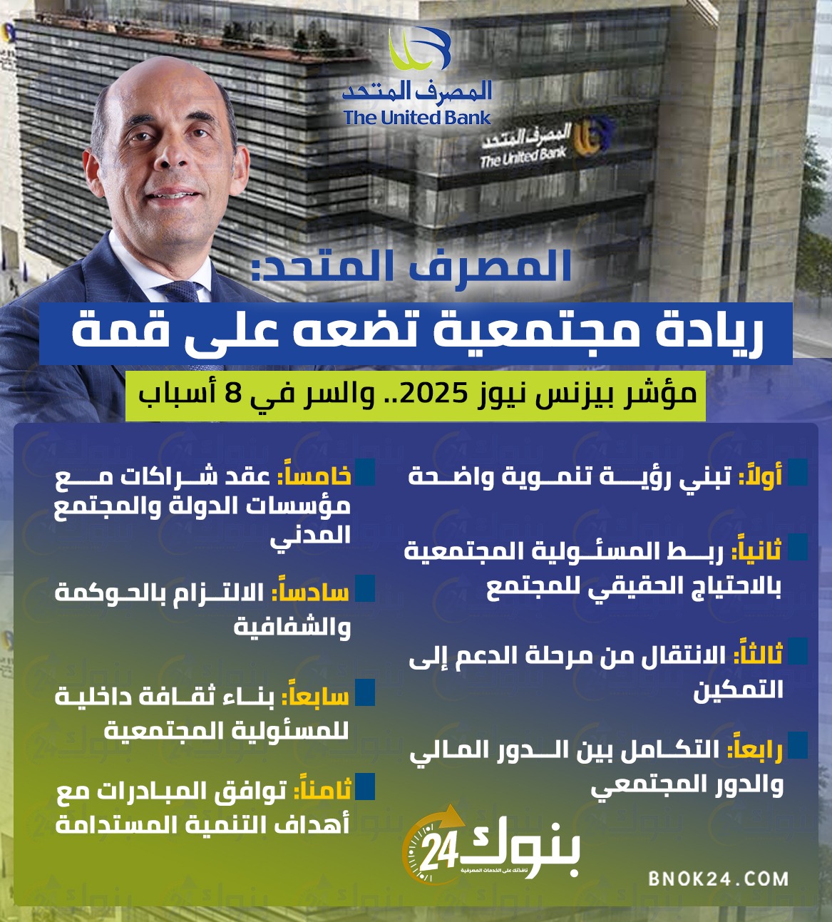 ويرجع تصدر المصرف المتحد مؤشرات بيزنس نيوز 2025 السنوي في مجال المسئولية المجتمعية إلى 8 ممارسات جعلت دوره يتجاوز حدود العمل المصرفي إلى كونه شريك حقيقي في أعمال التنمية المستدامة .