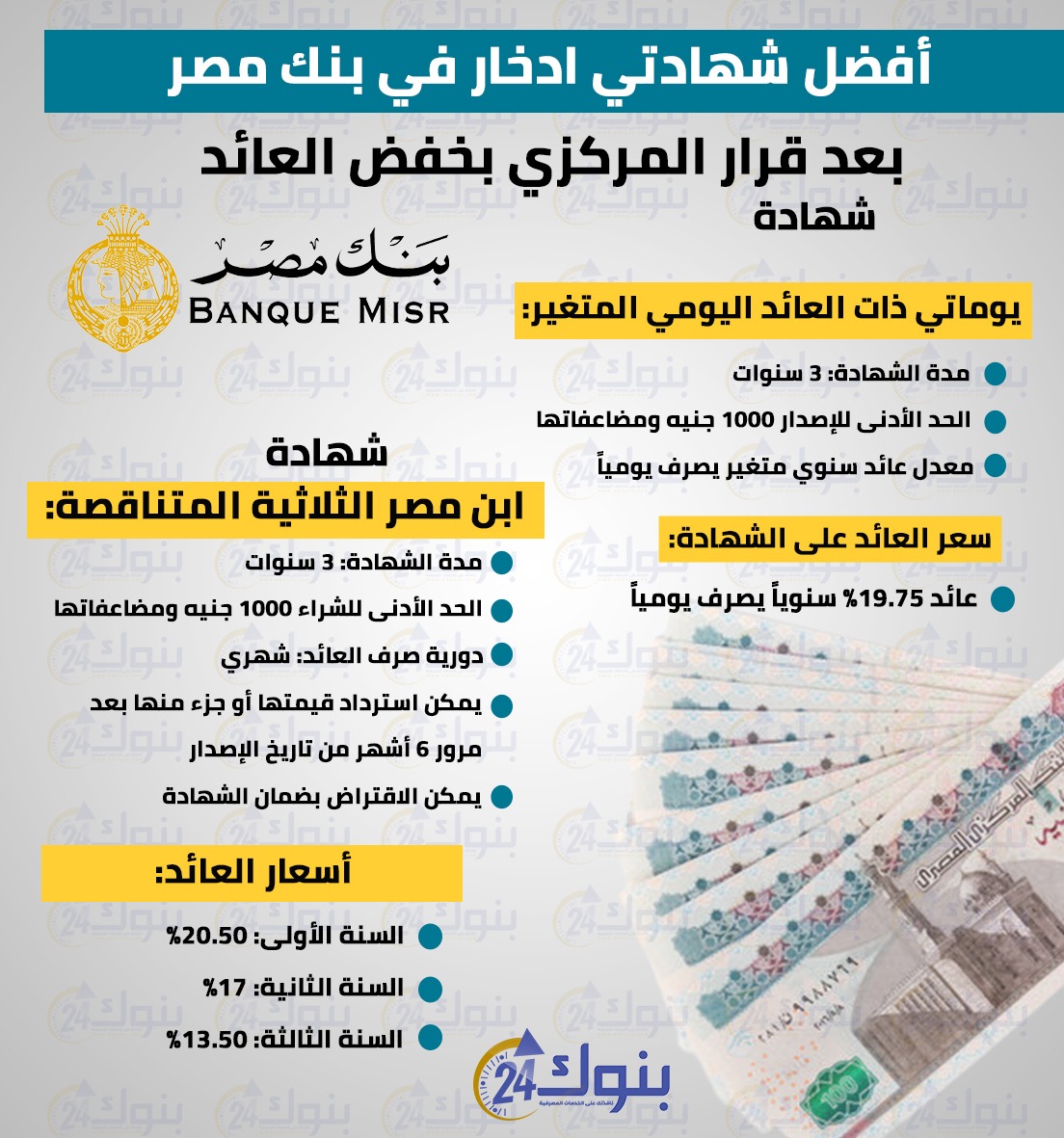 بوابة “بنوك 24” ترصد في الانفوجرافيك التالي أفضل شهادتي ادخار في بنك مصر بعد قرار المركزي بخفض العائد .