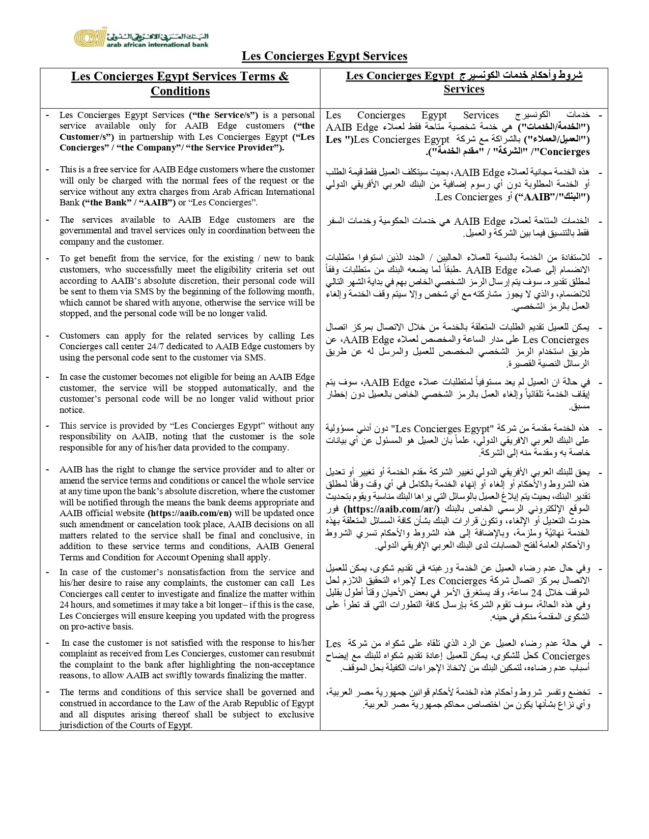 أعلن البنك العربي الأفريقي الدولي، عبر صفحته الرسمية على موقع التواصل الاجتماعي فيسبوك، عن أحدث الخدمات التي يقدمها حصرياً لعملائه، وهي خدمة الكونسيرج، والتي تتيح للعملاء مجموعة مميزة من الخدمات كحجز الفنادق والسفر، خدمات العناية بالمنزل وخدمة الليموزين وغيرها من المزايا الأخرى بدون أي رسوم إضافية.