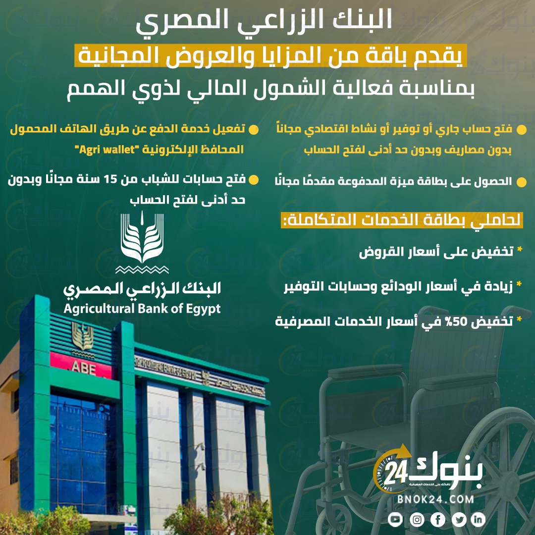 البنك الزراعي المصري يقدم باقة من المزايا والعروض المجانية بمناسبة فعالية الشمول المالي لذوي الهمم «إنفوجرافيك»