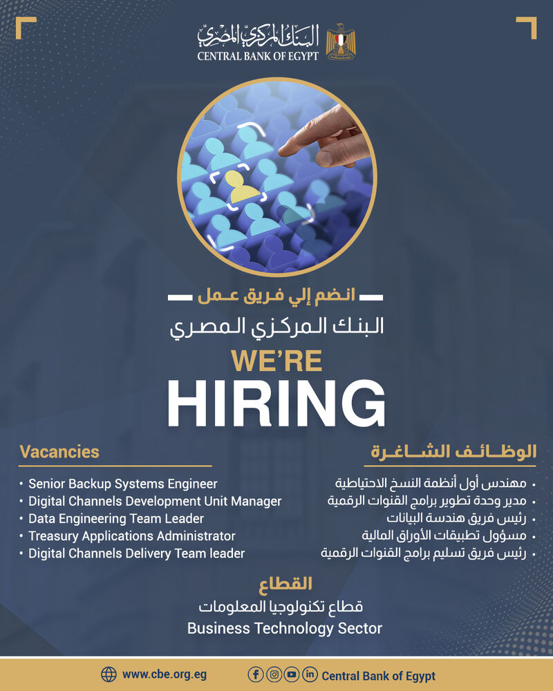 وقال البنك المركزي إنه تتوافر لديه الوظائف الشاغرة التالية بقطاع تكنولوجيا المعلومات: