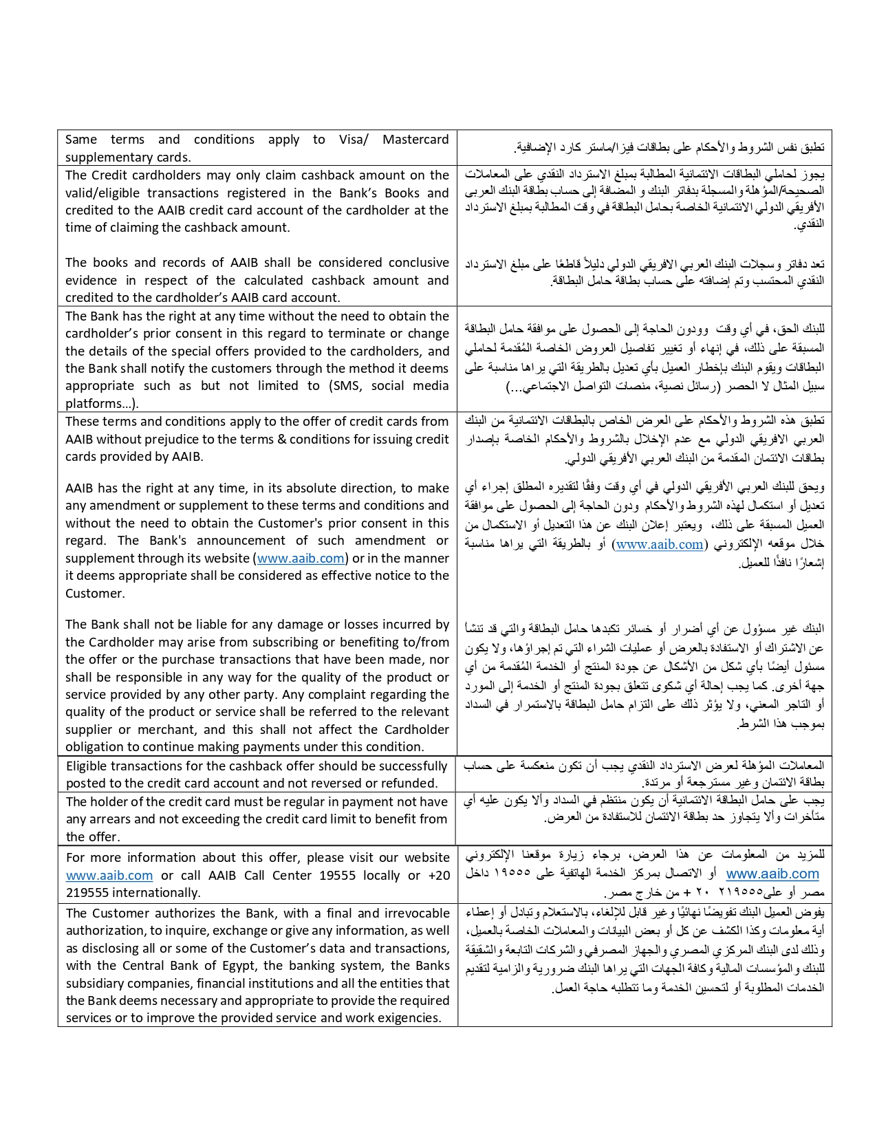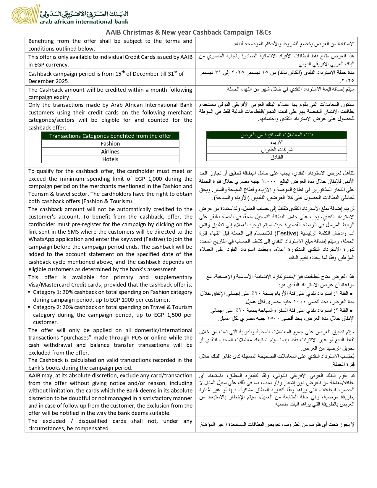 ويتيح البنك للعملاء الاحتفال بموسم رأس السنة والاستمتاع باسترداد نقدي بنسبة 20% حتى 2500 جنيه أثناء السفر والسياحة والموضة عند الدفع ببطاقات AAIB الائتمانية.