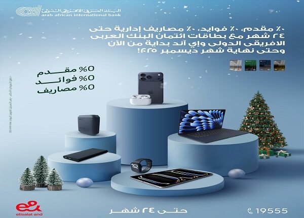 ويتيح البنك للعملاء شراء أحدث الموبايلات الجديدة وجميع المشتريات الإلكترونية بسهولة من فروع إي آند بالتقسيط حتى 24 شهرًا بدون مقدم، بدون فوائد، بدون مصاريف ادارية، وذلك عند الدفع ببطاقات ائتمان البنك العربى الافريقى الدولى حتى نهاية شهر ديسمبر 2025.